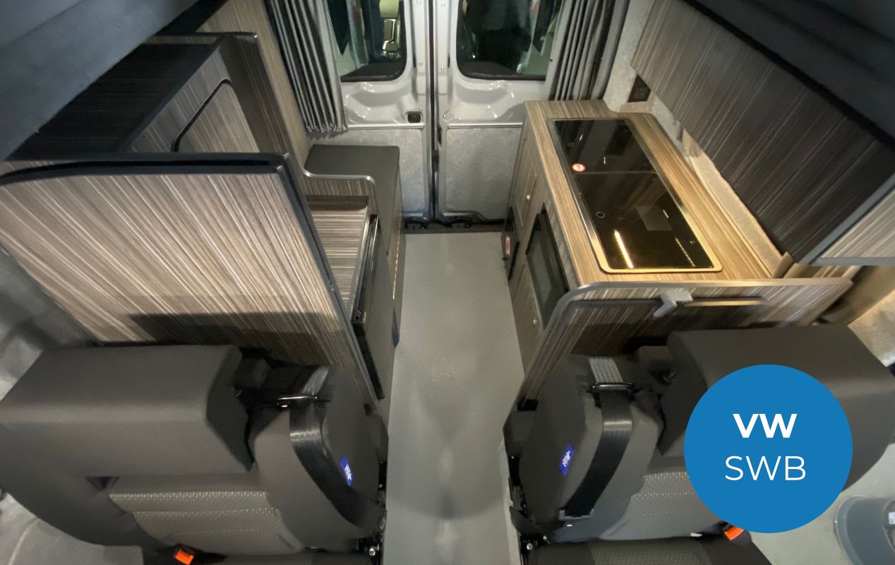 For parents wanting their children to sit closer to them near to the front of the camper or for couples planning a lot of travelling, our rear kitchen campervan conversion layouts make for comfortable wild camping, combined with great ‘go anywhere’ flexibility. With lots of storage space, this 4 or 5 seater, 2 or 4 berth family campervan boasts 2 single Neptune RIB M1 tested beds with sliders and integrated headrests, as standard, whilst offering housing space for a porta potti or fixed flush toilet. Add our heating and hot water system and you can even have a hot shower!
