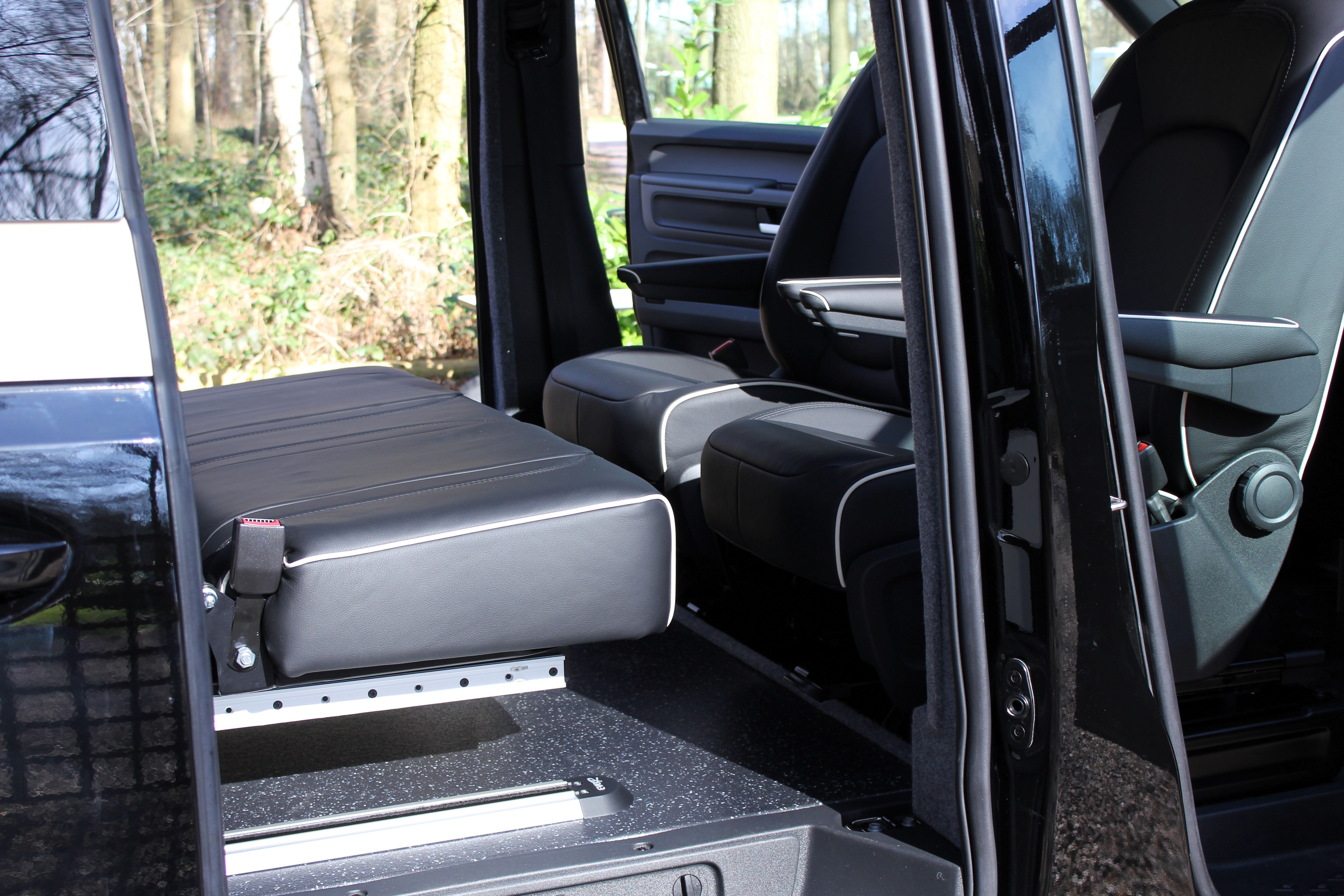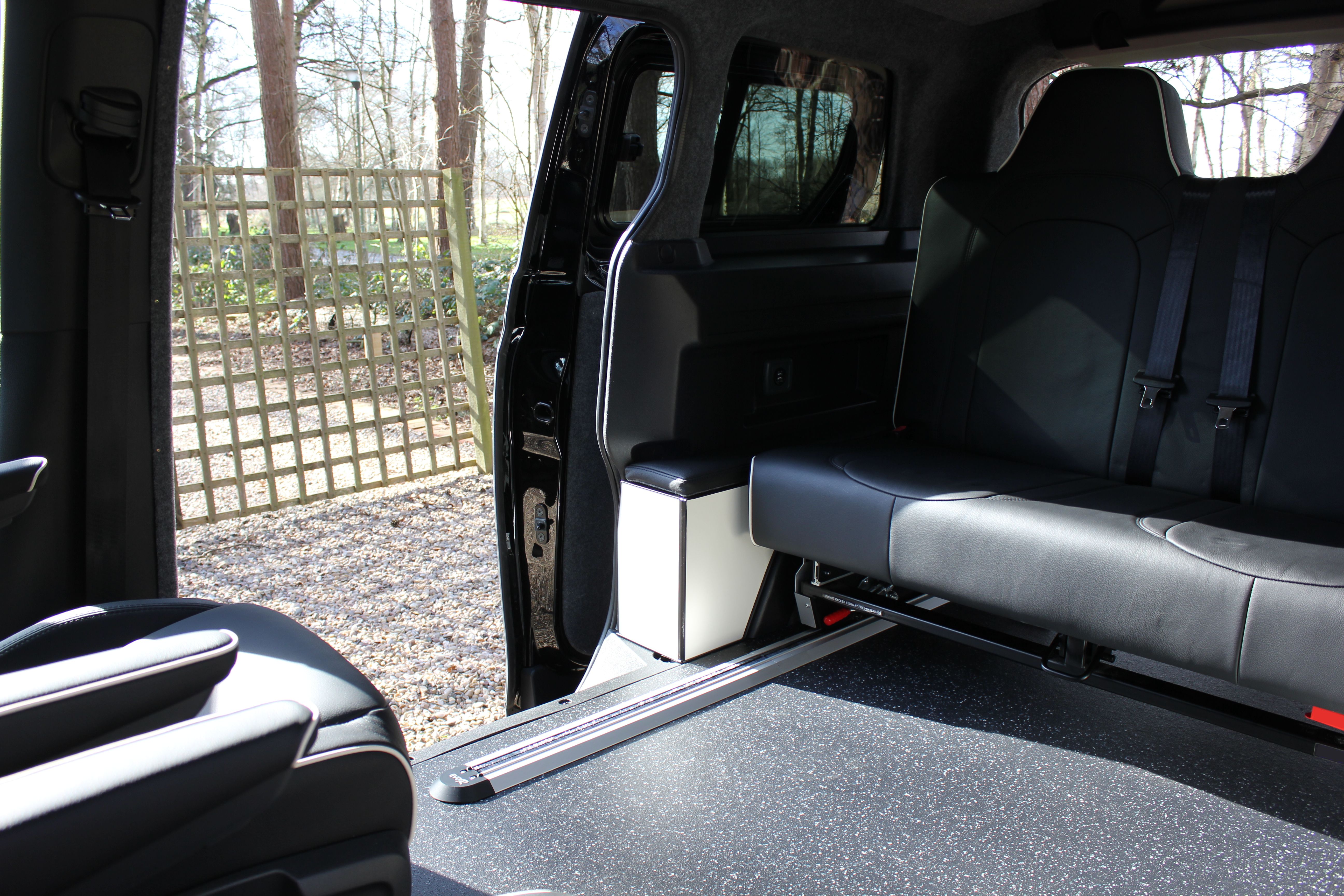 Our innovative Volkswagen ID. Buzz Kombi Sleeper conversion, offering rear travelling seats to a Cargo van in the form of an M1 certified crash tested bed on rail system.