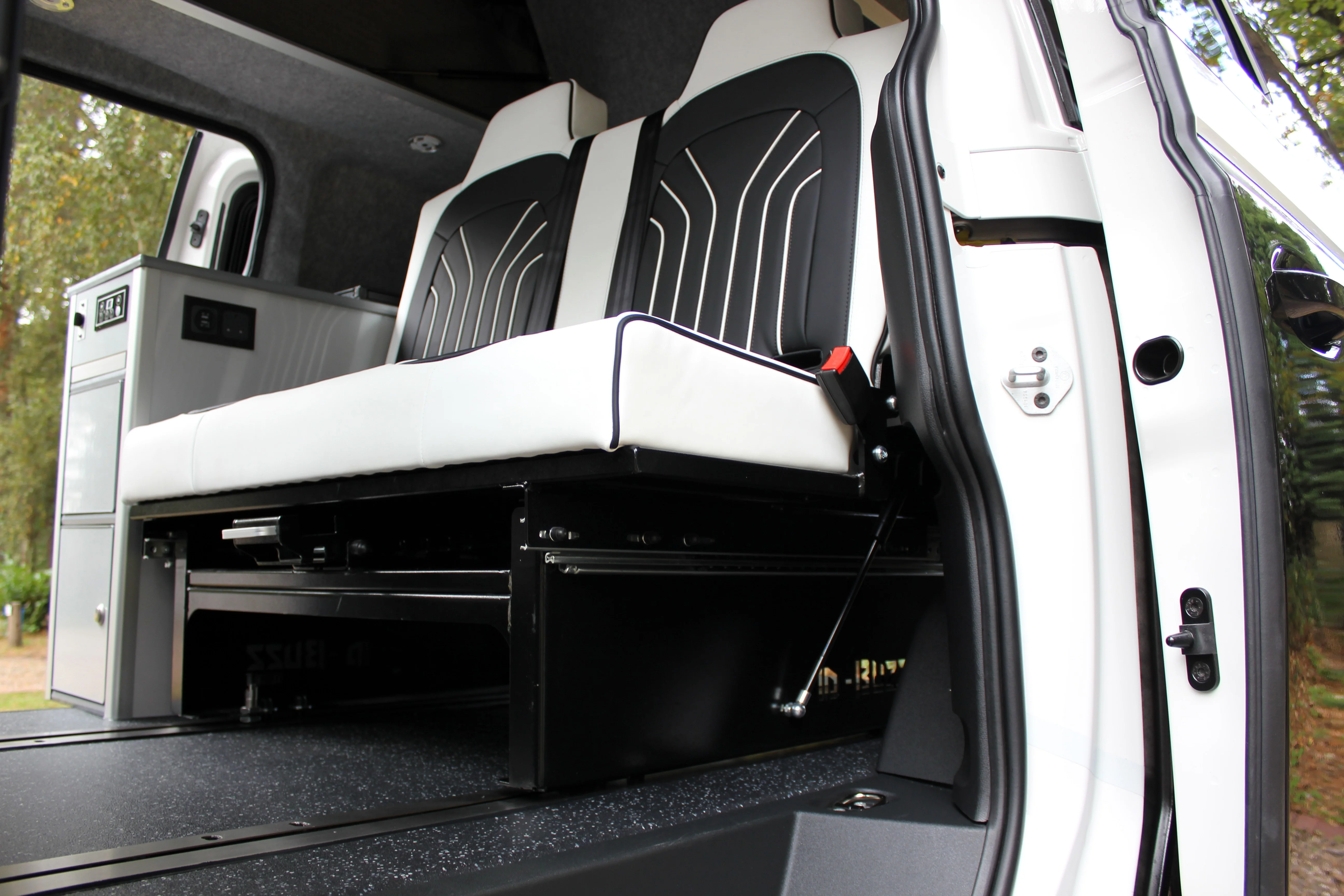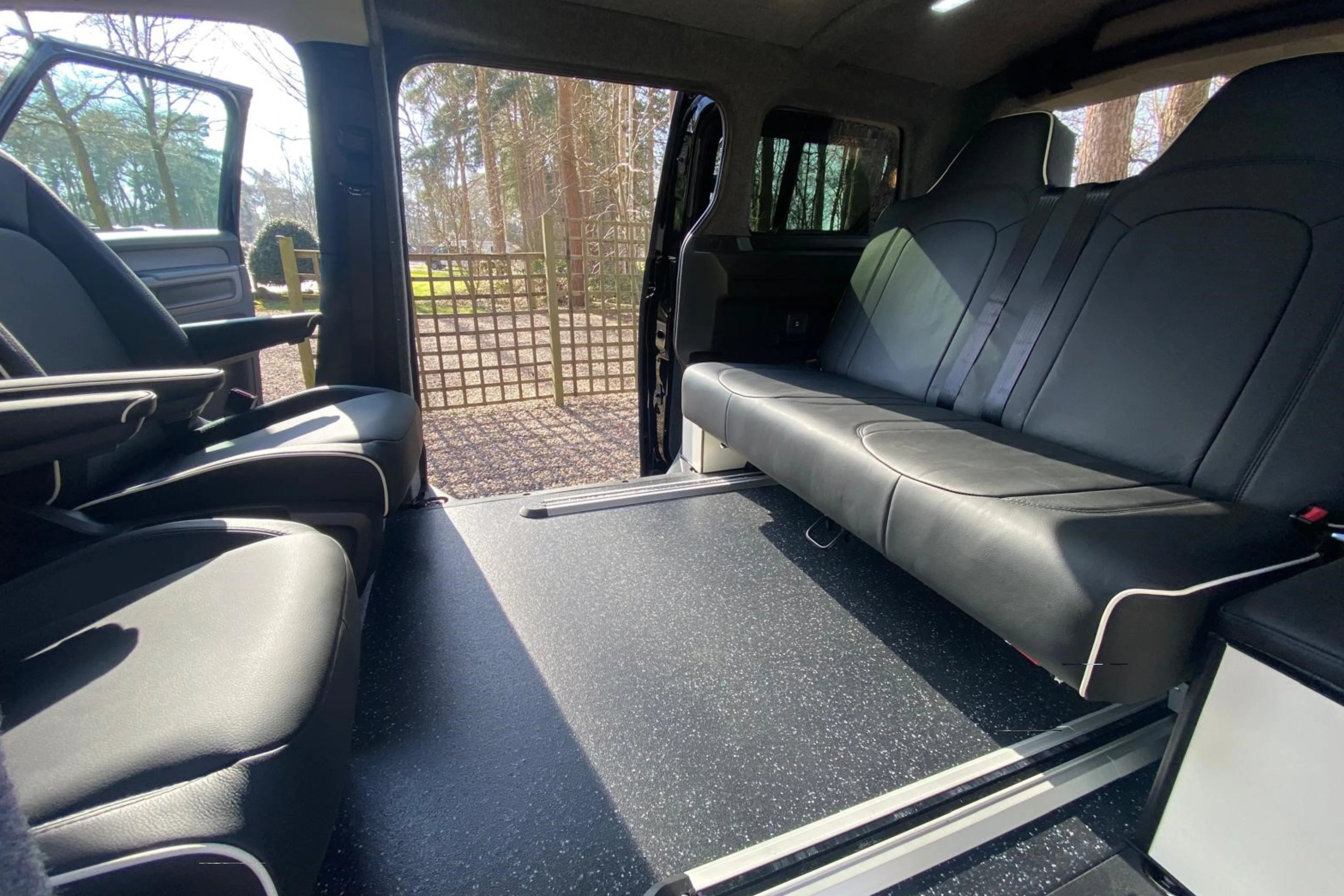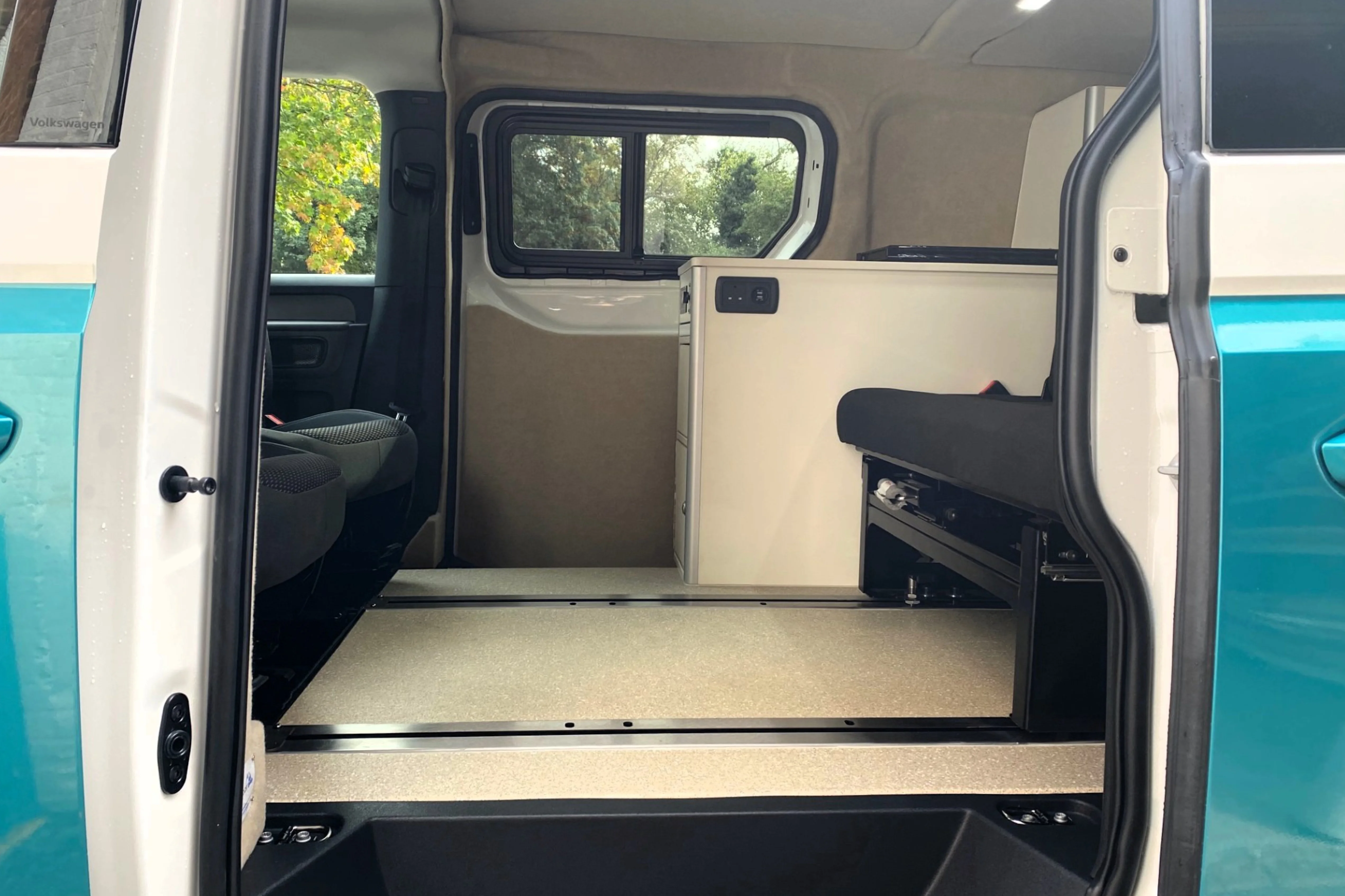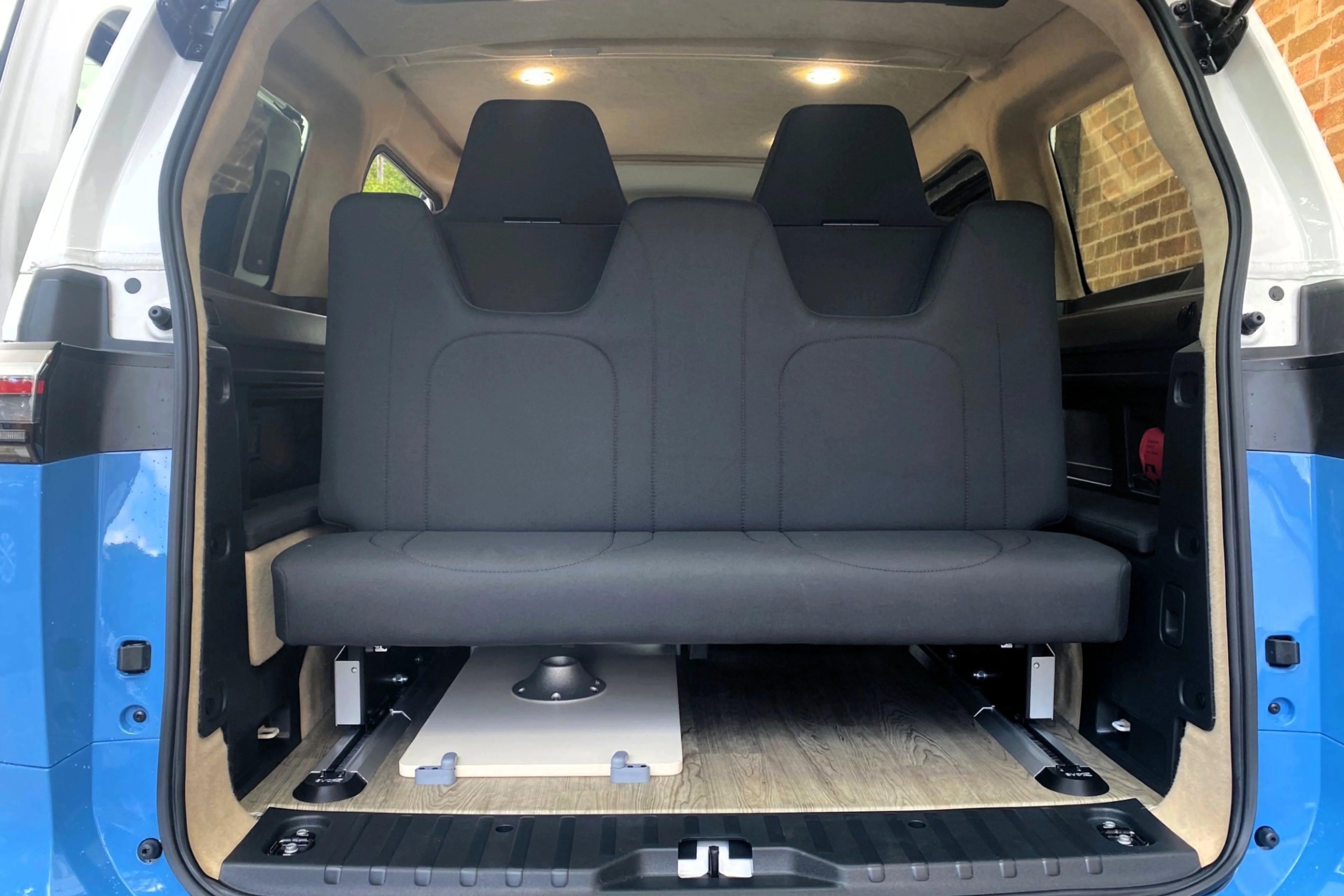 Our Volkswagen ID. Buzz Kombi Sleeper conversion, offering rear travelling seats to a Cargo van in the form of an M1 certified crash tested bed on rail system.