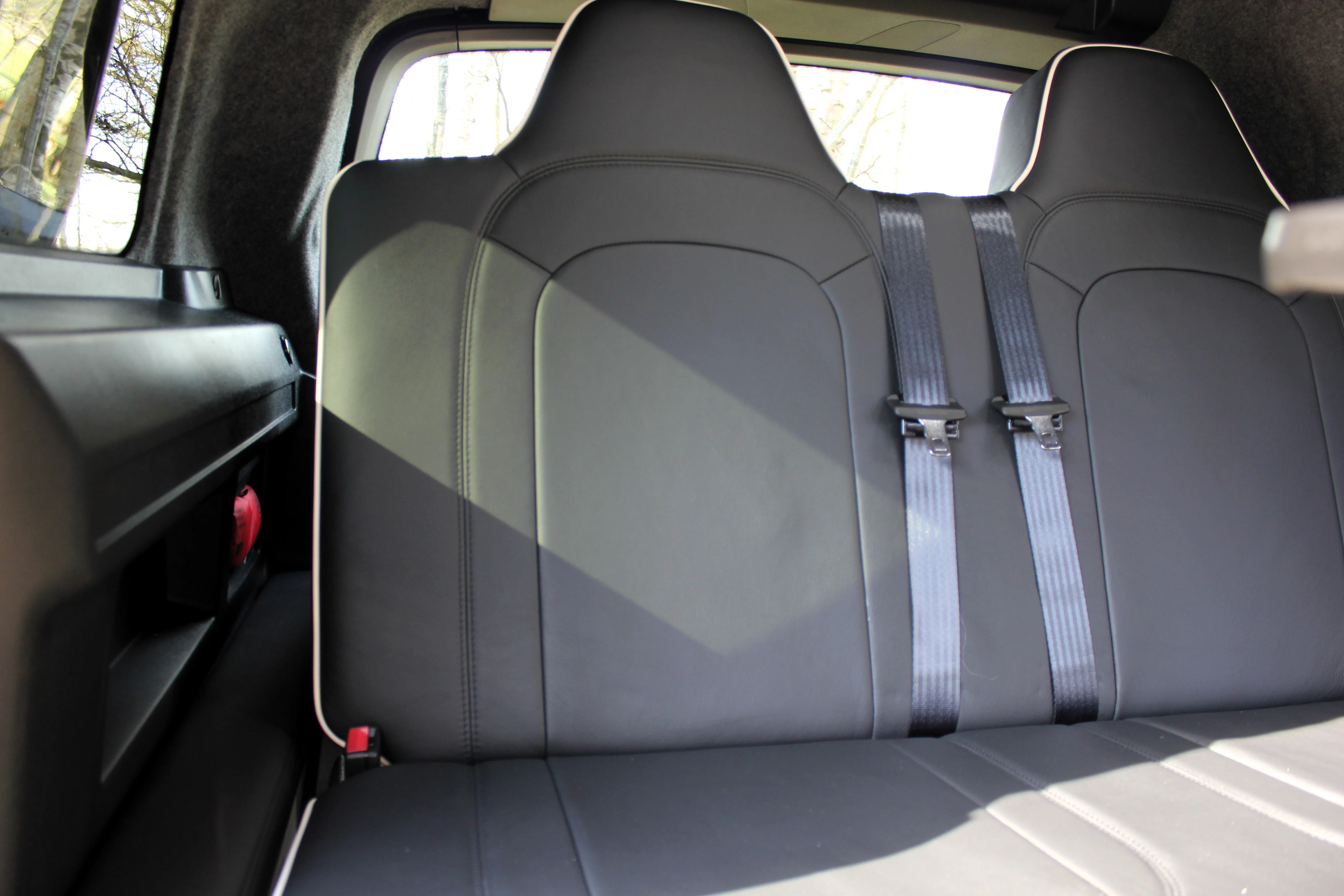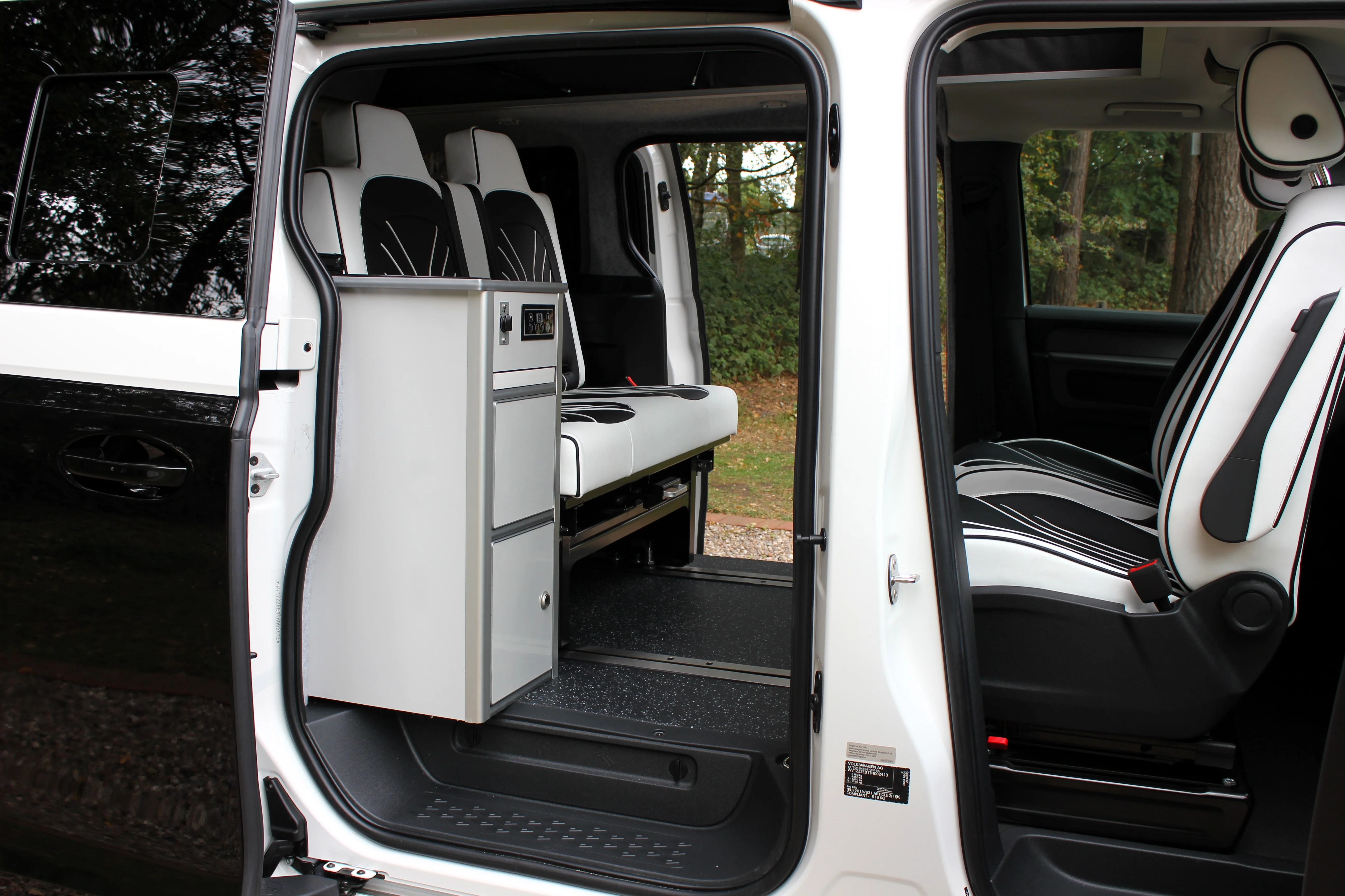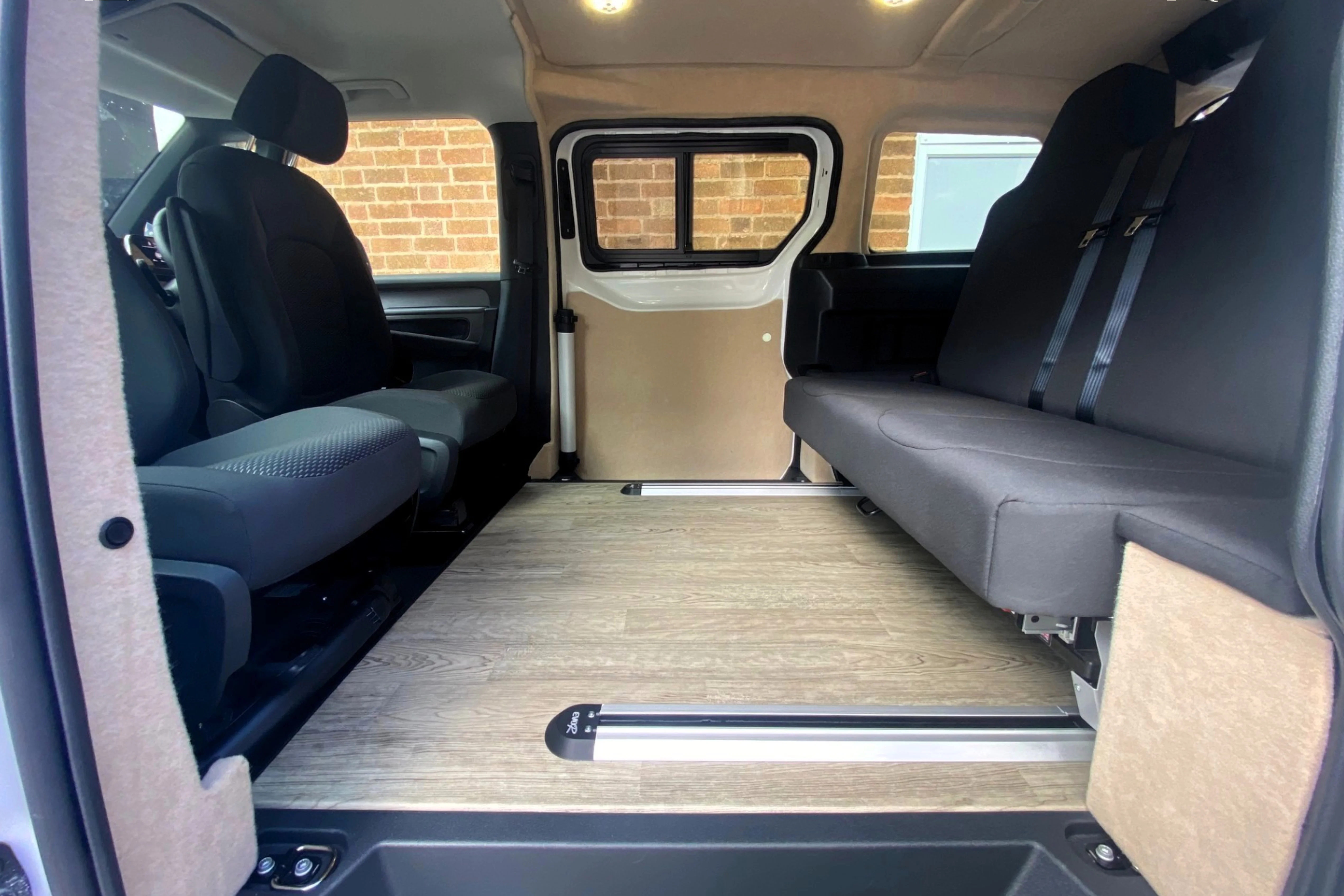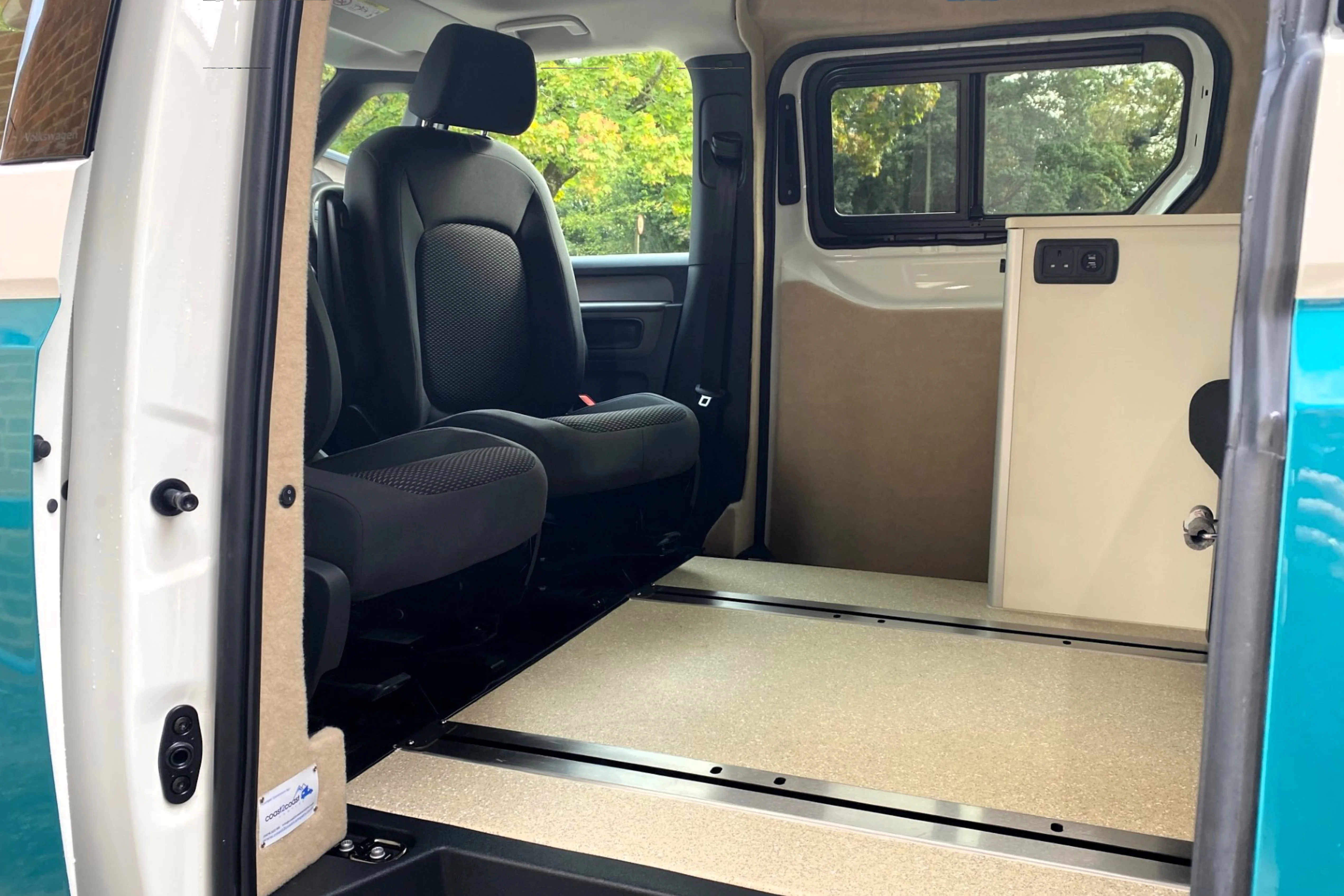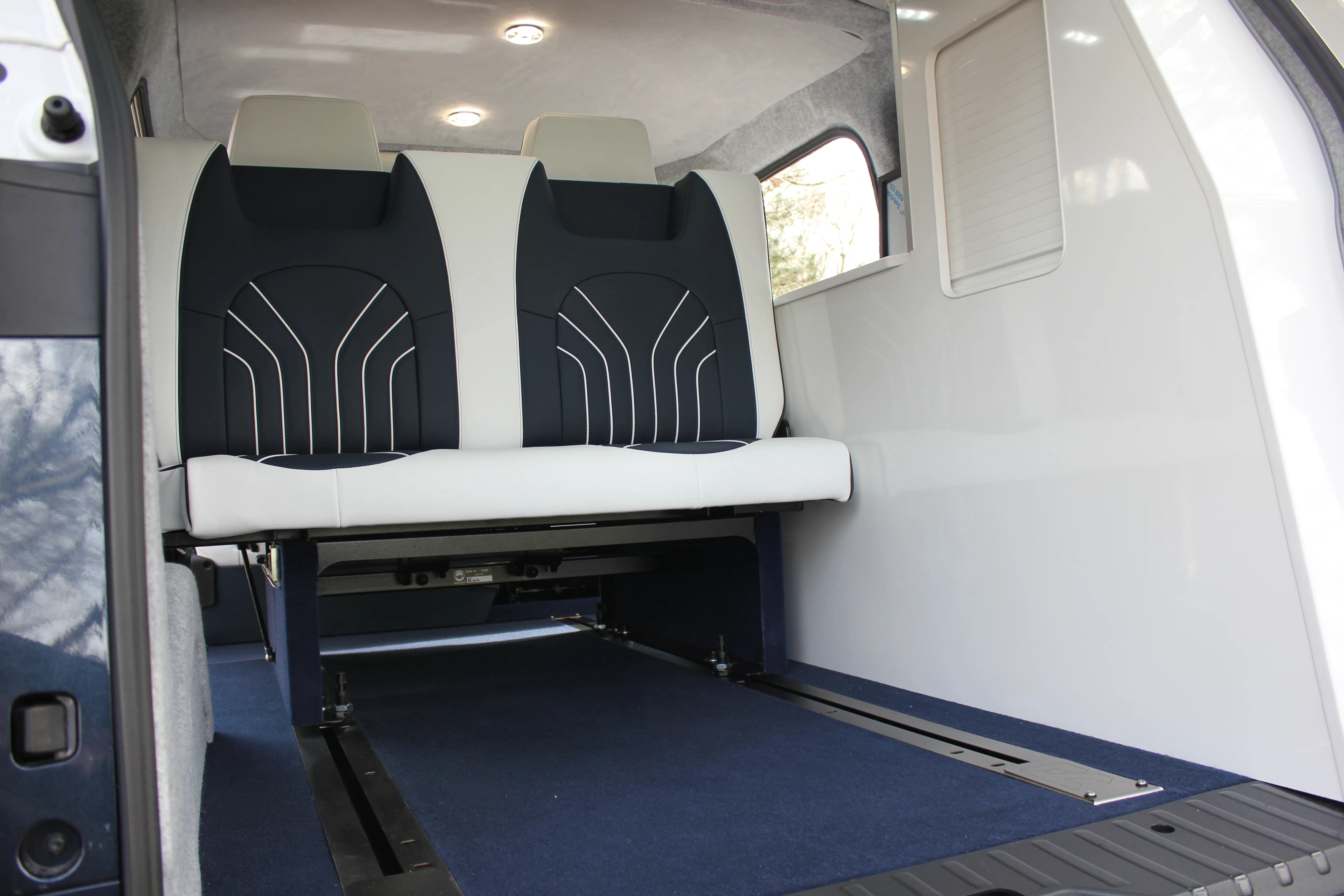 Our Volkswagen ID. Buzz Kombi Sleeper conversion, offering rear travelling seats to a Cargo van in the form of an M1 certified crash tested bed on rail system.