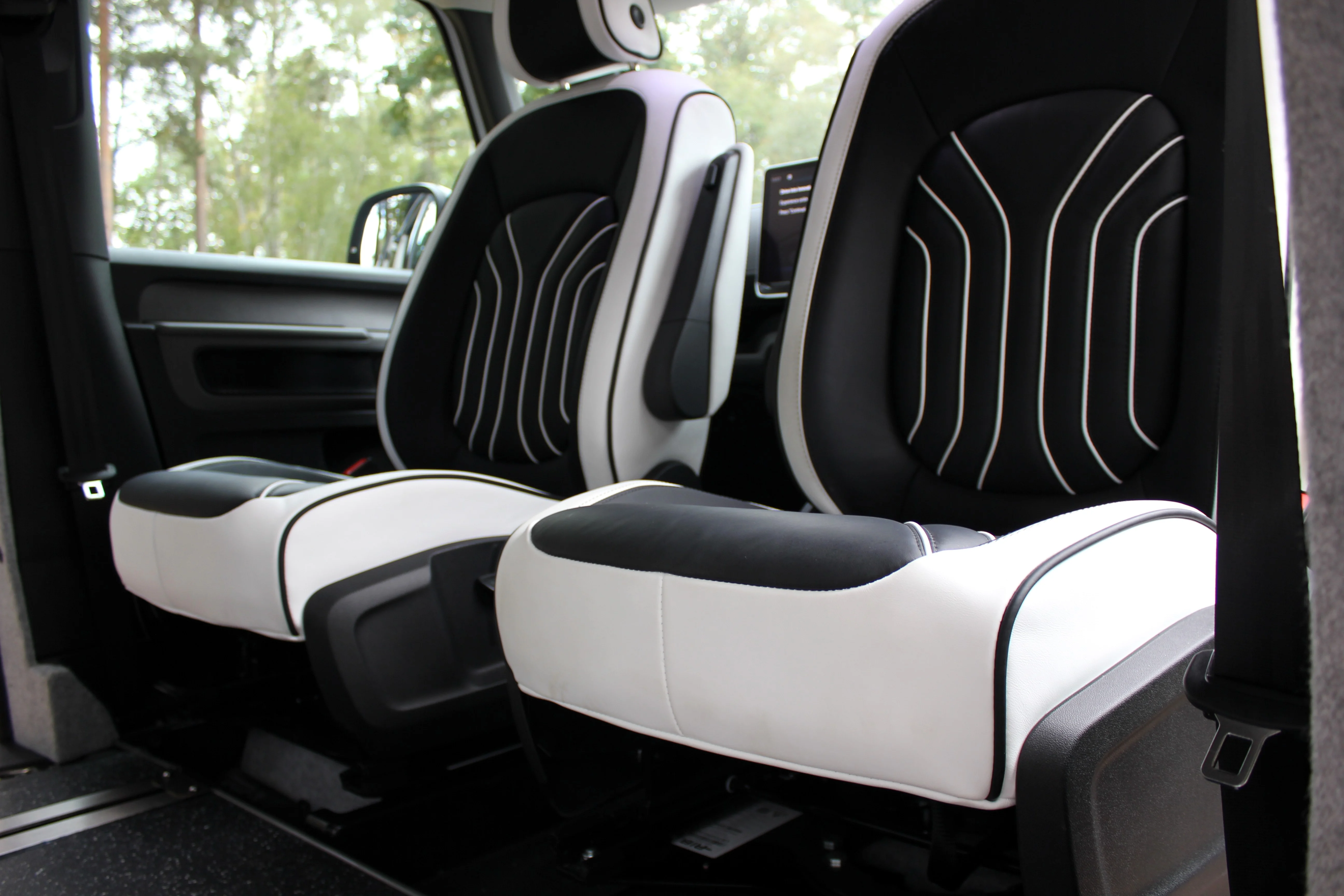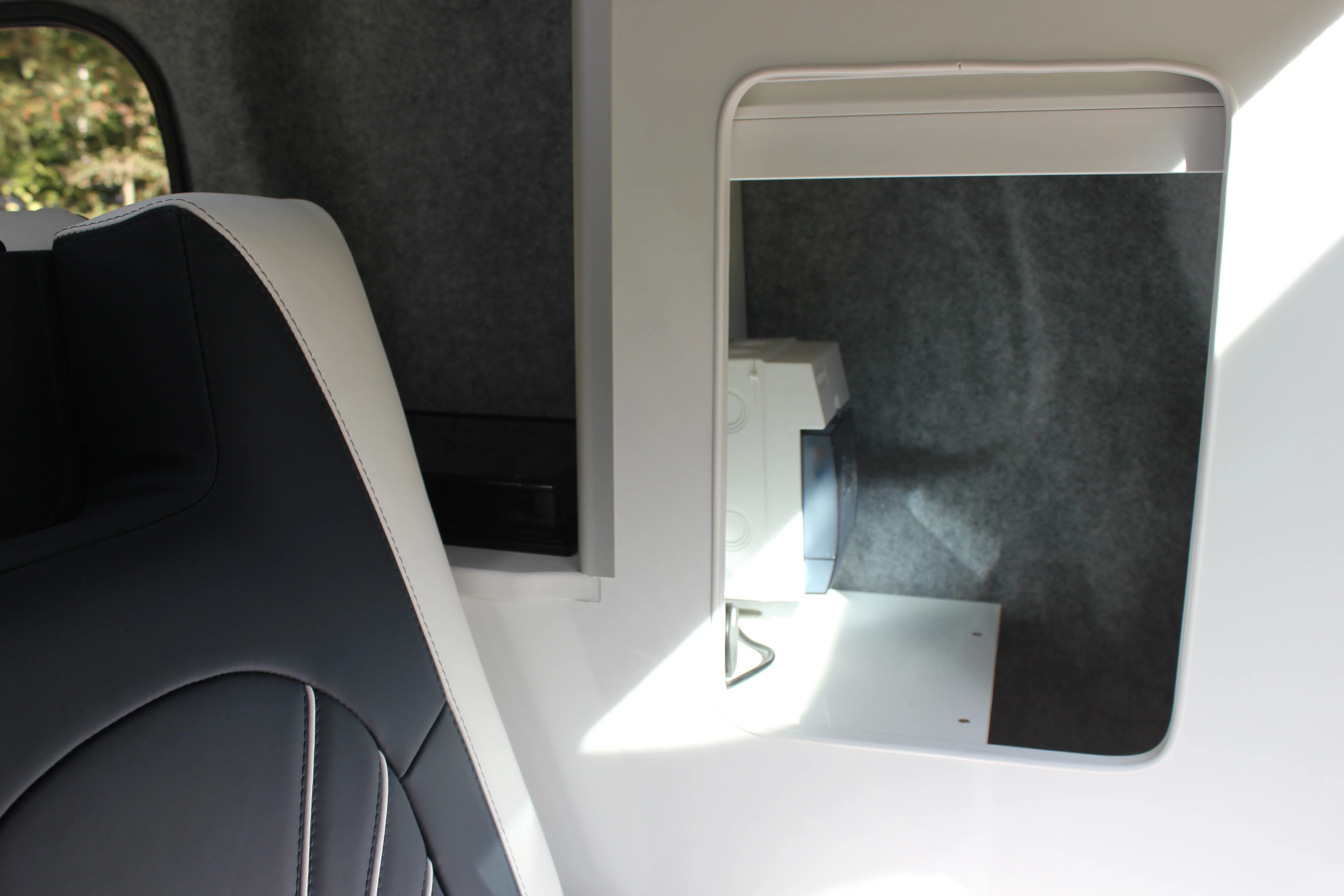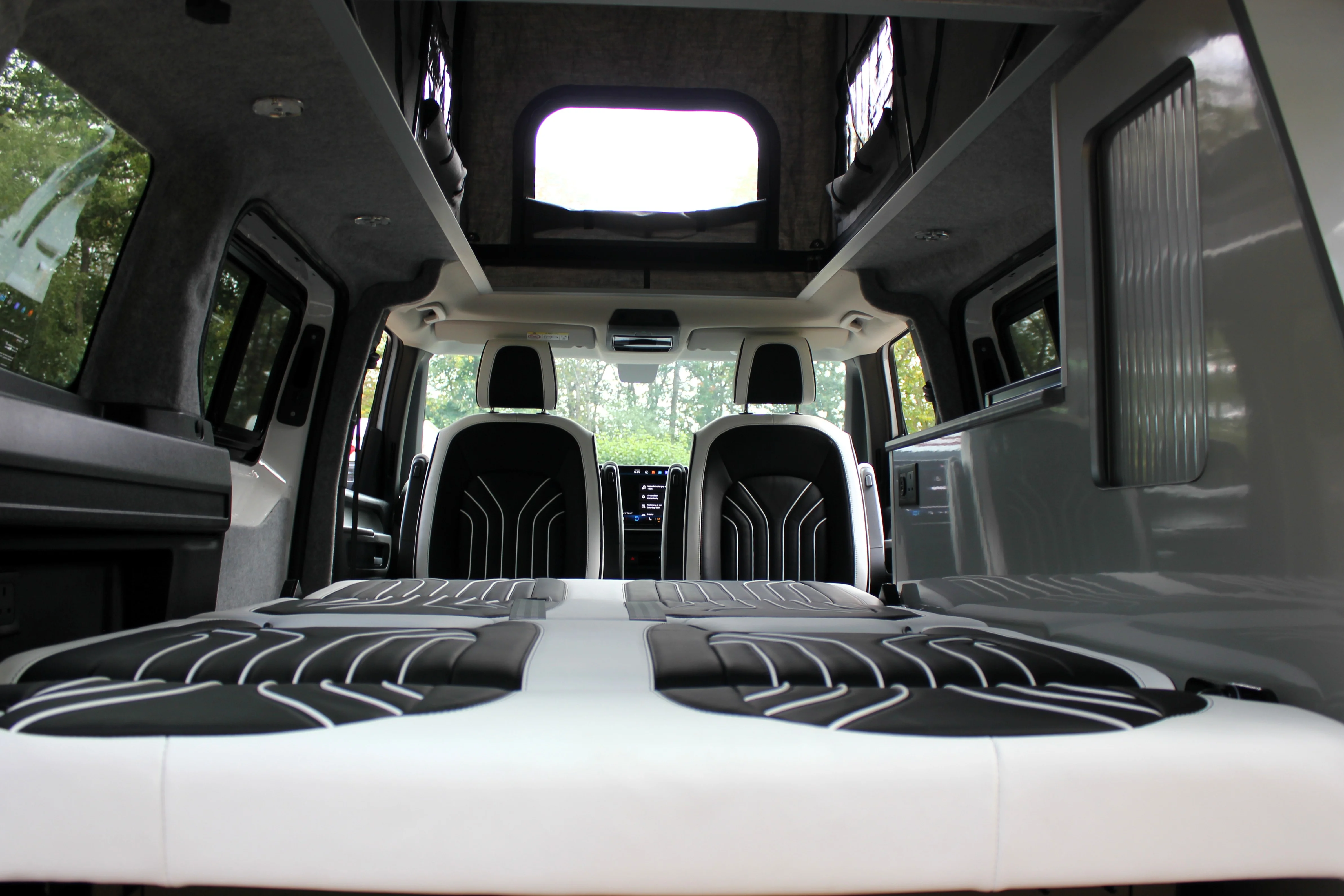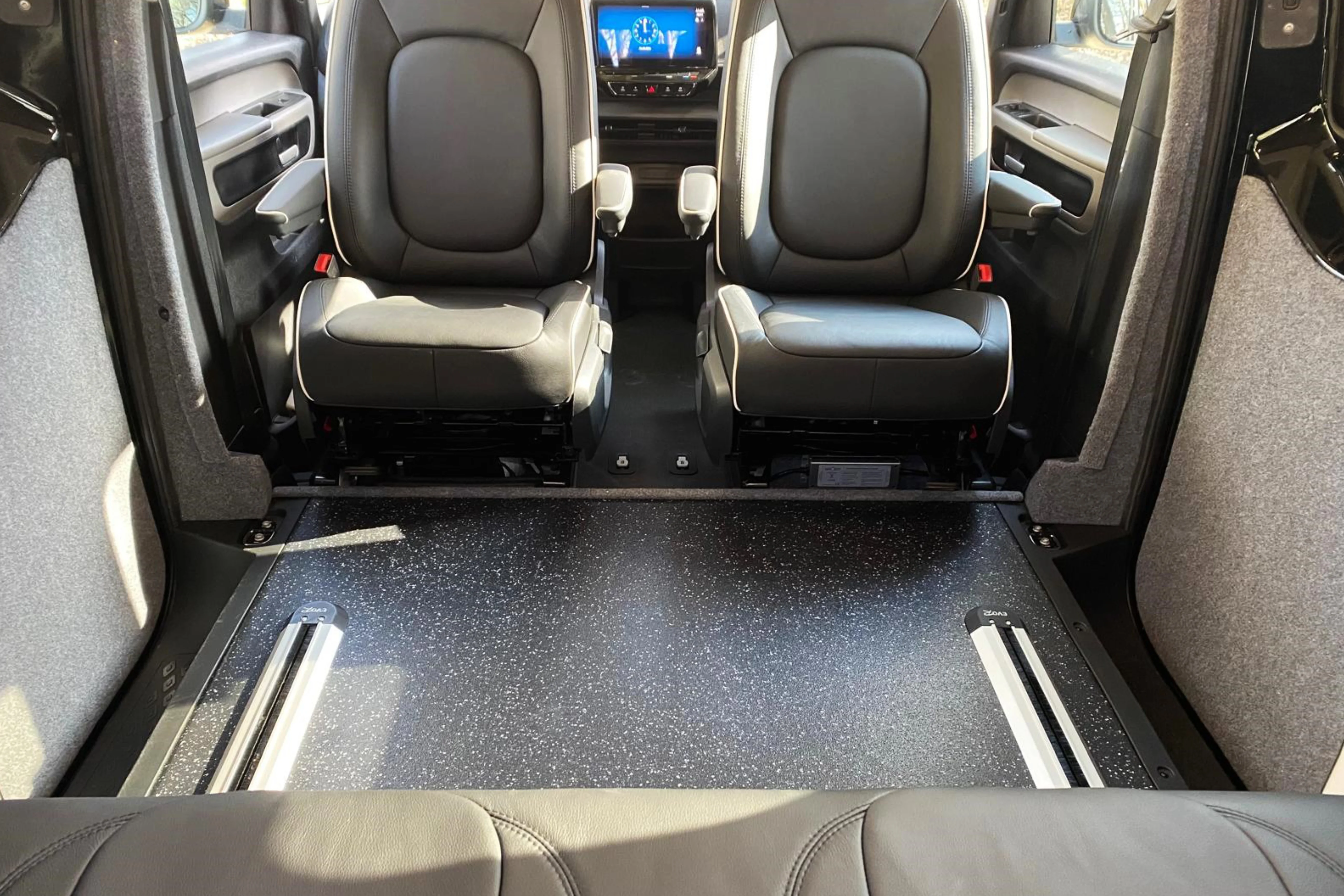 Our Volkswagen ID. Buzz Kombi Sleeper conversion, offering rear travelling seats to a Cargo van in the form of an M1 certified crash tested bed on rail system.