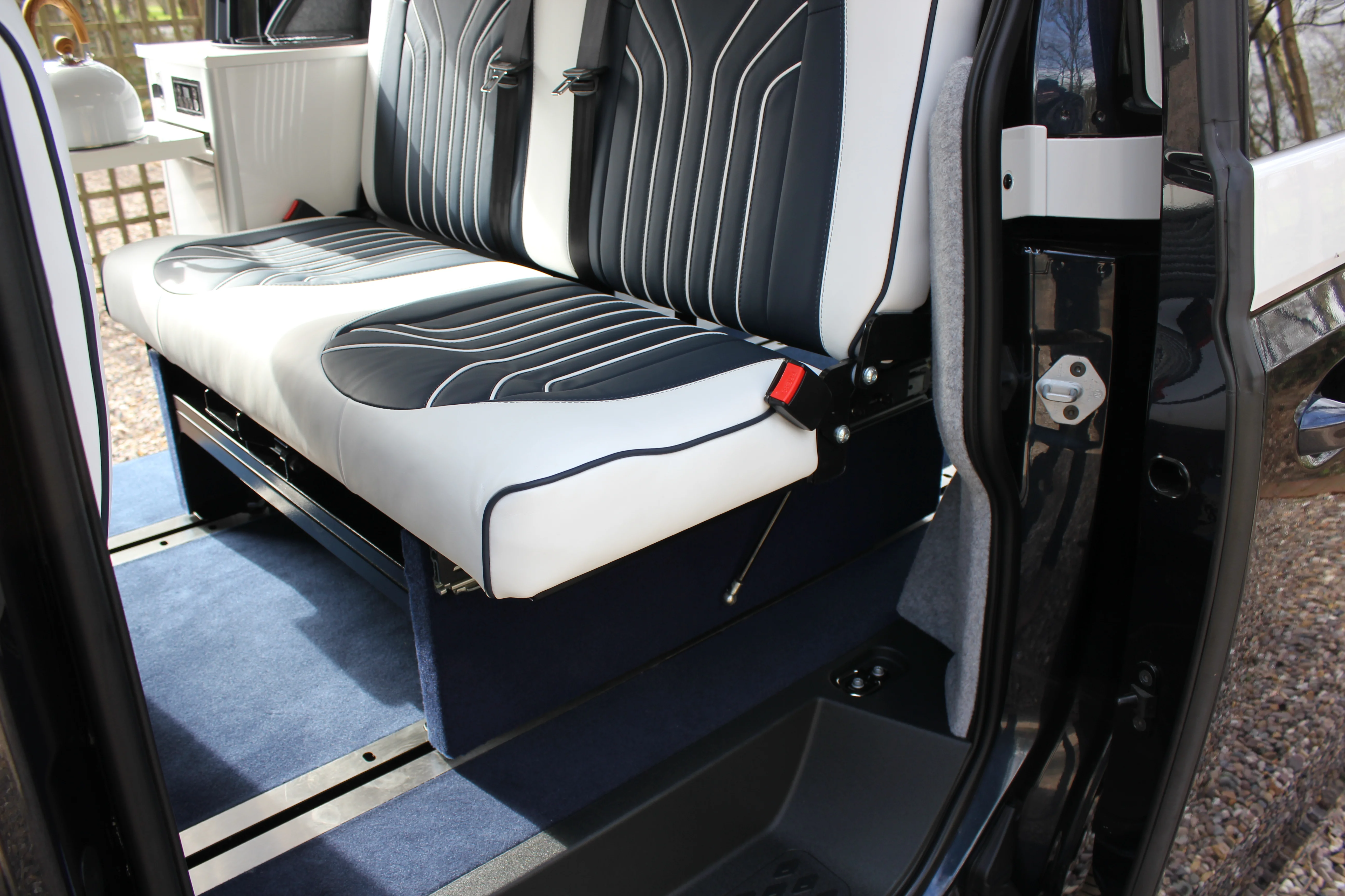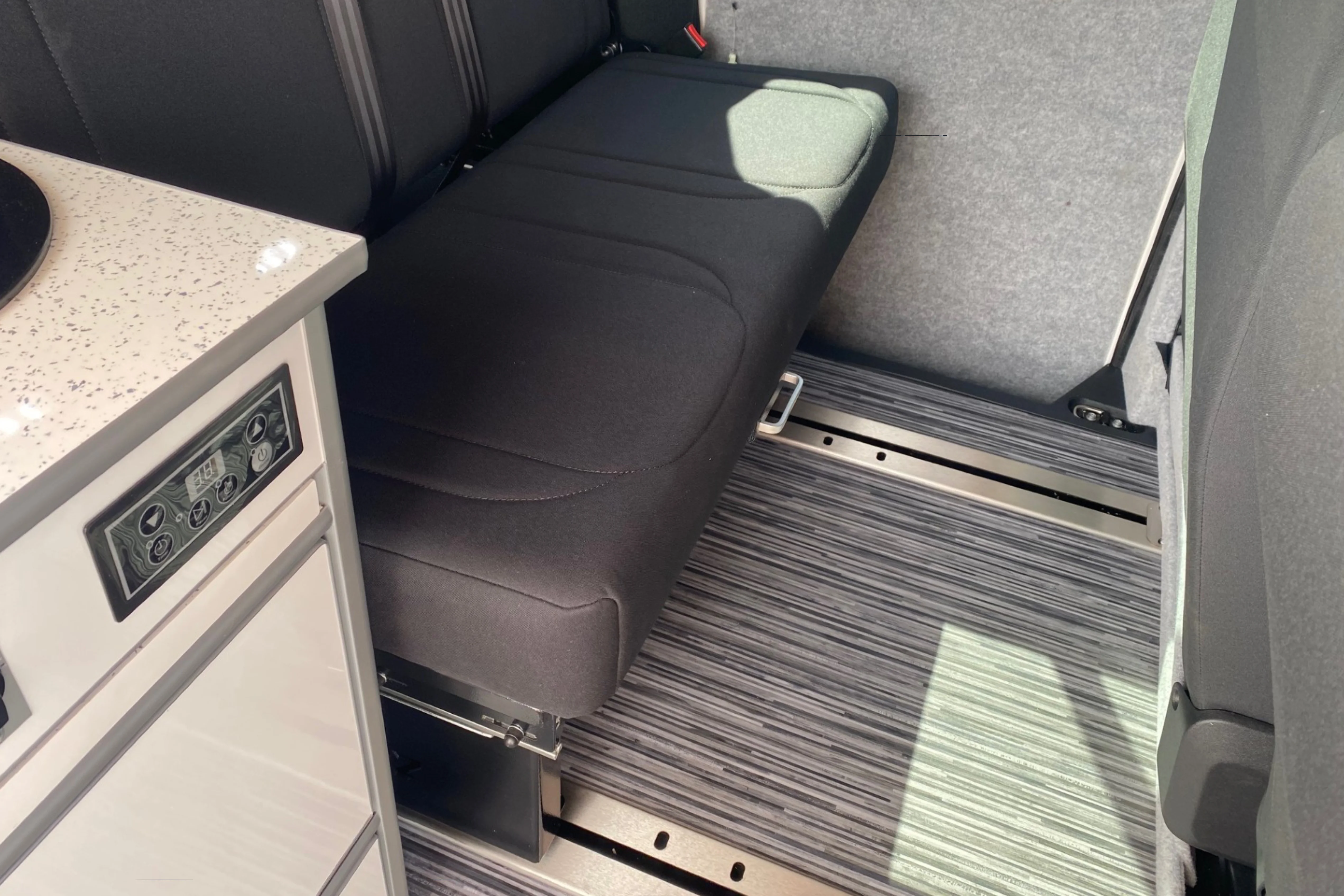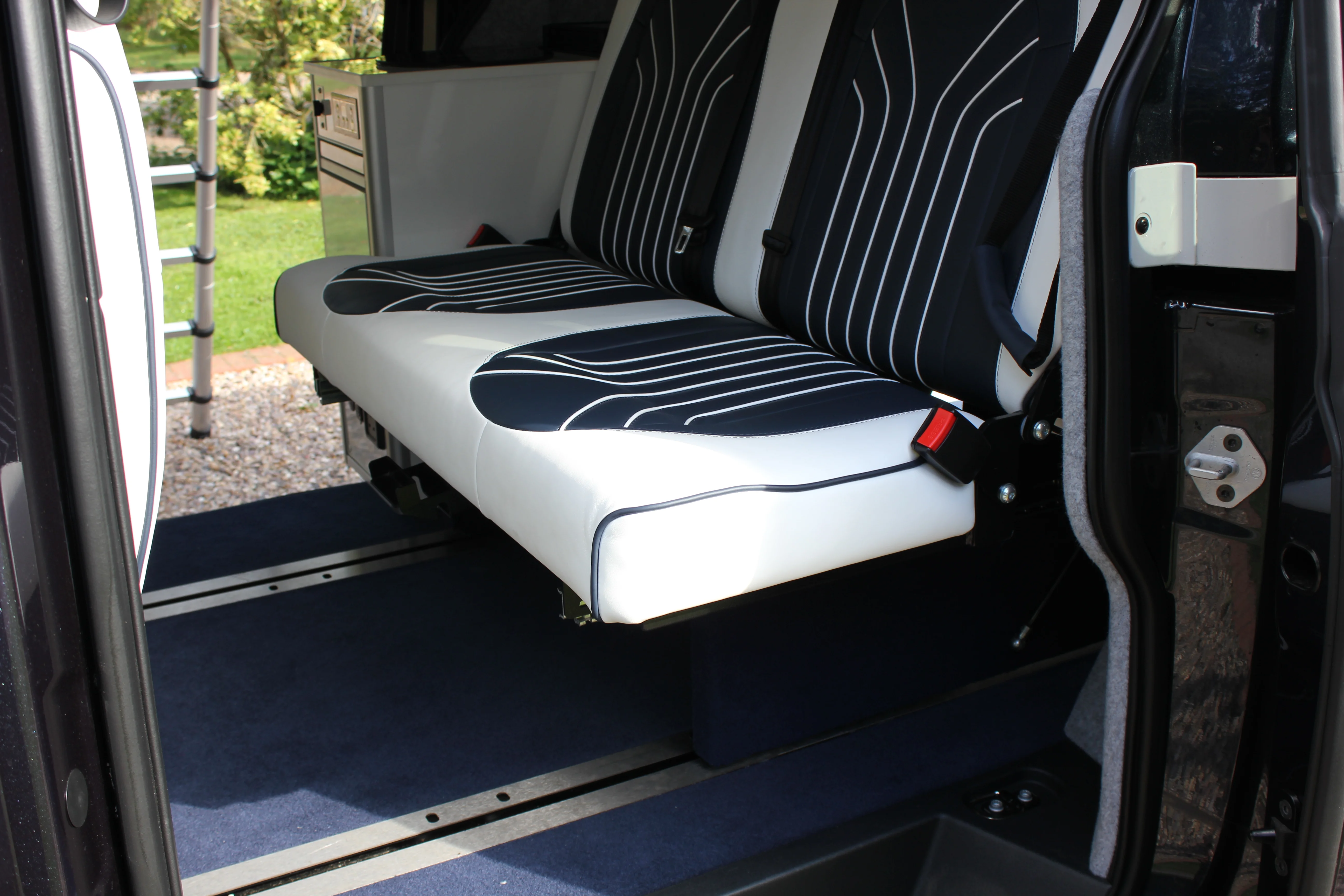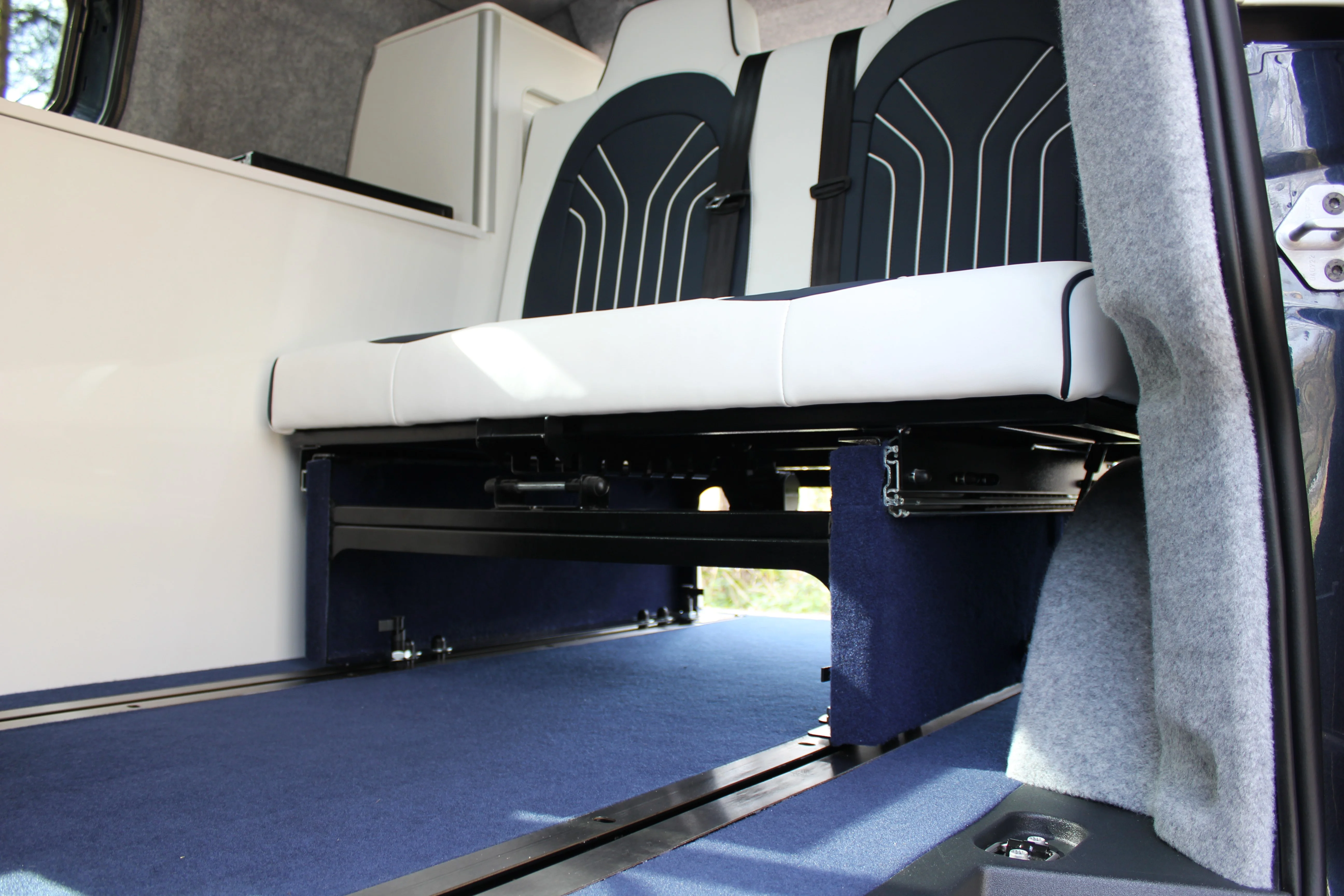 Electric M1 tested 2-seater Rock and Roll bed system upholstered in VW trim, with integrated floor rails