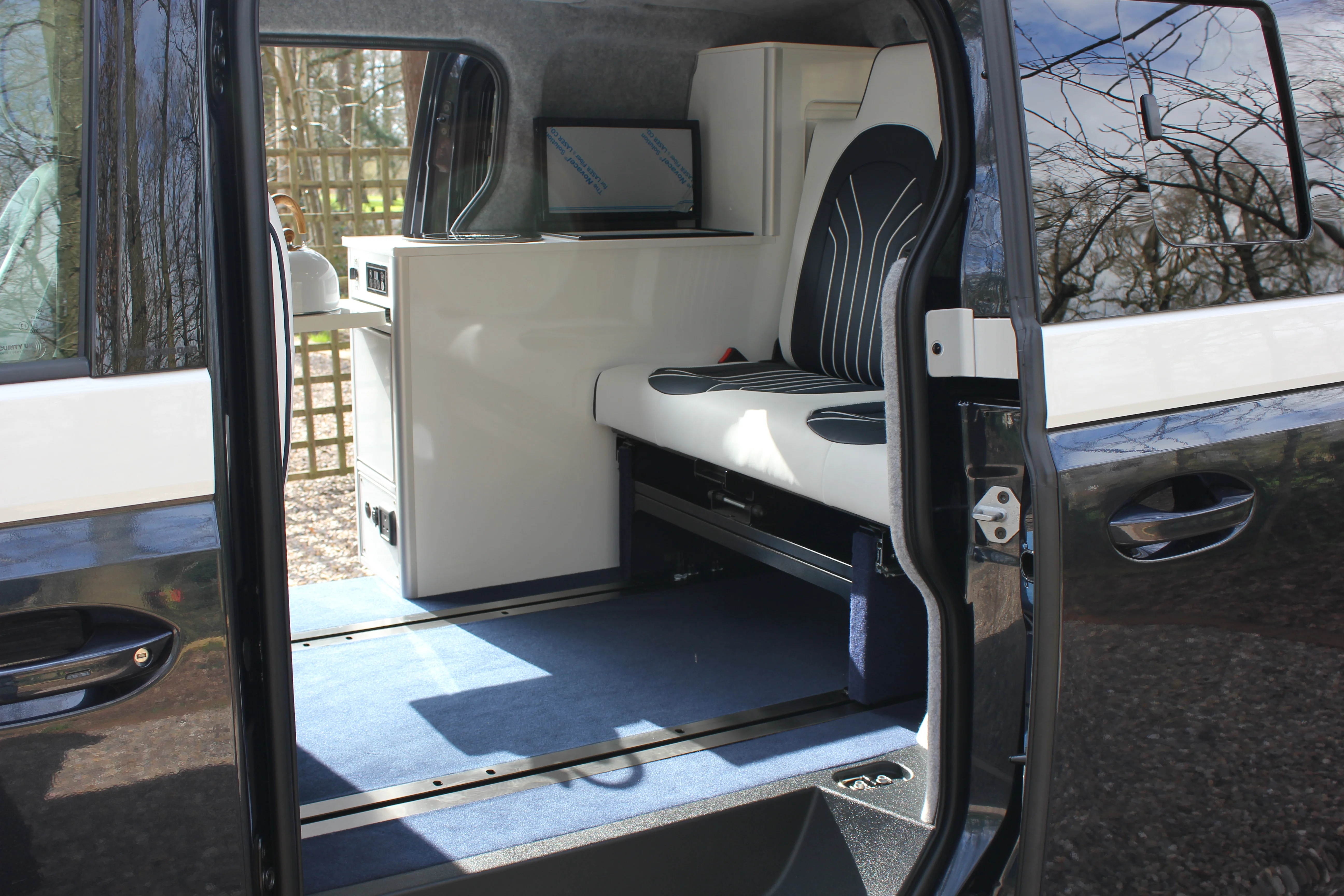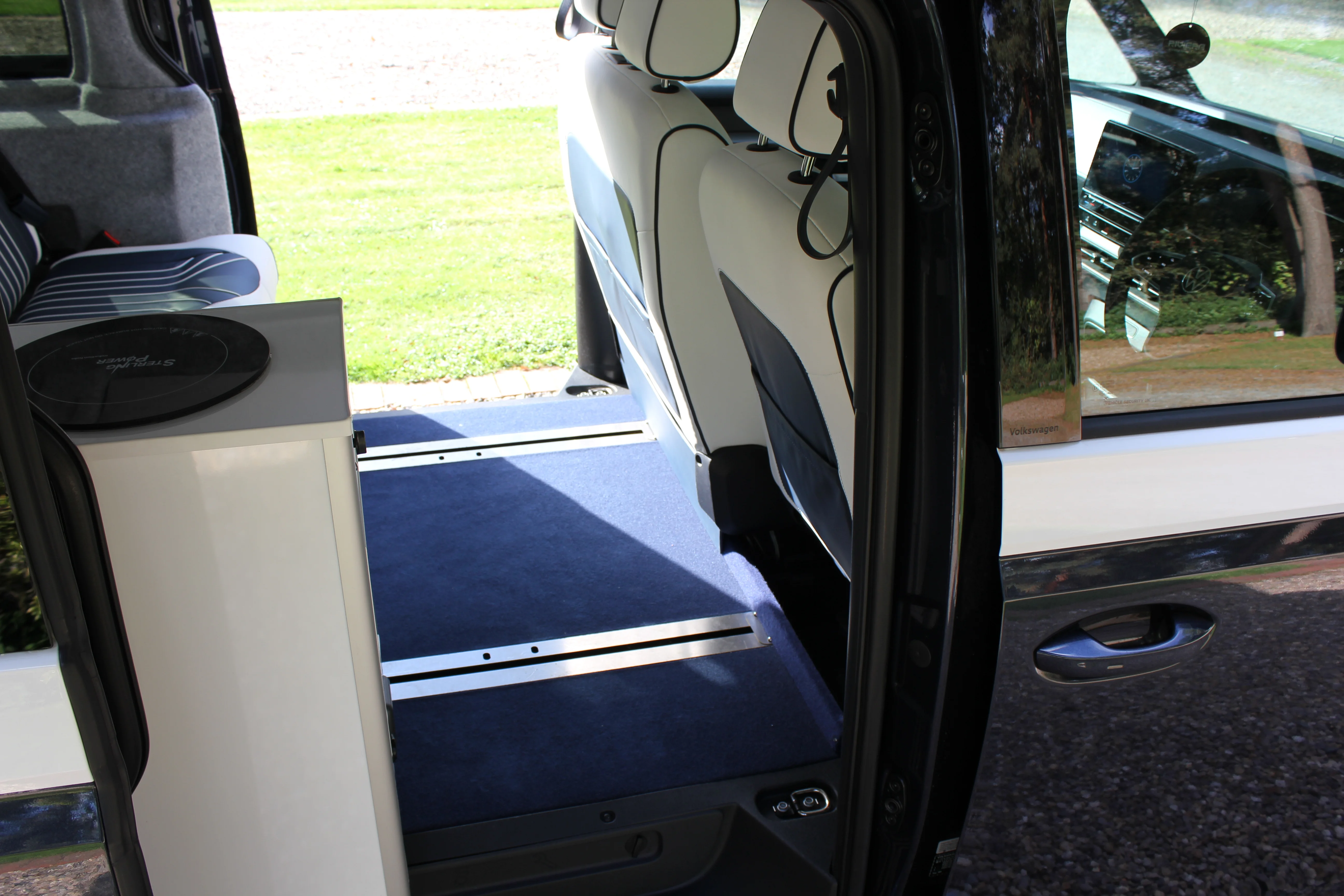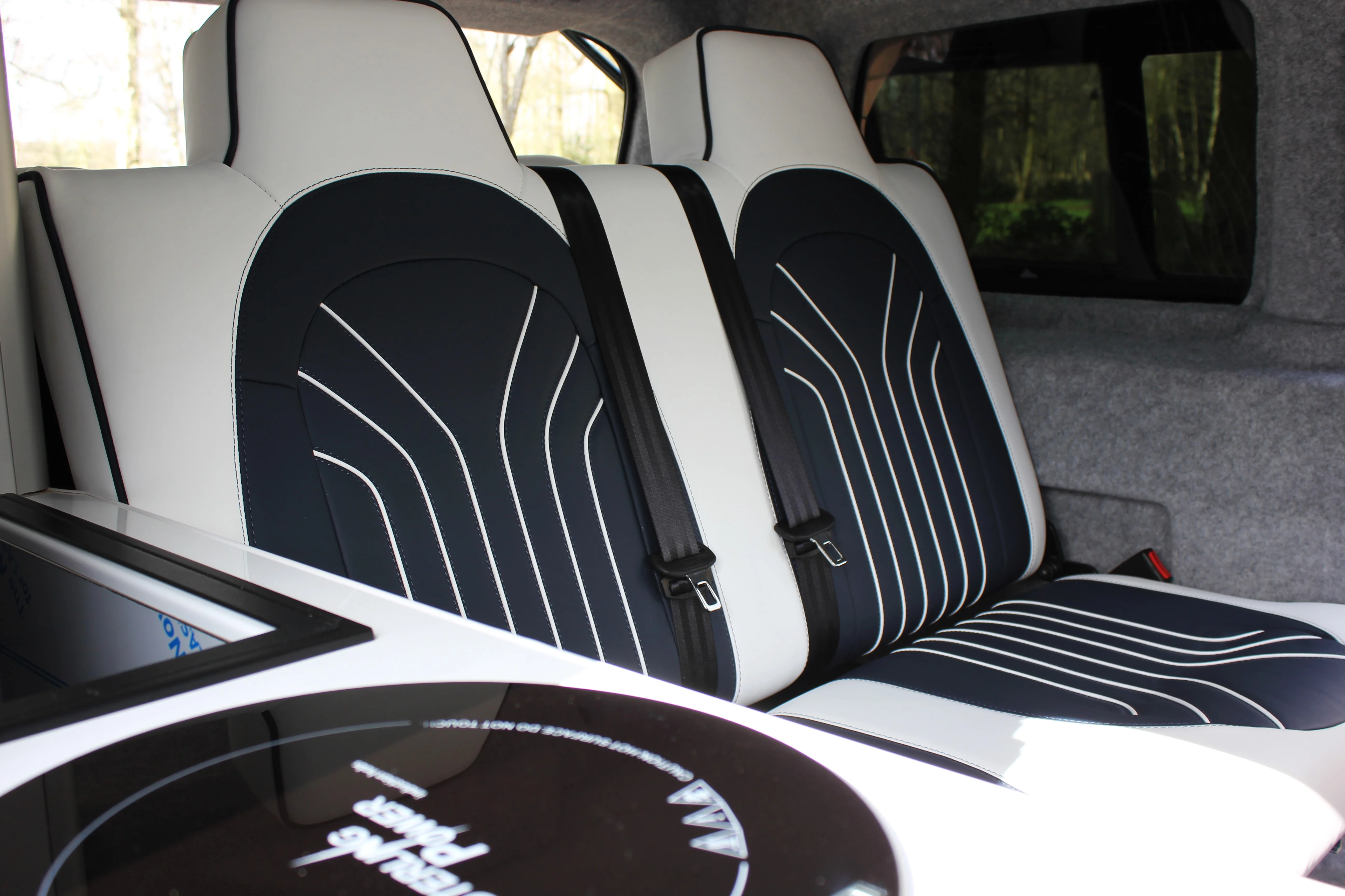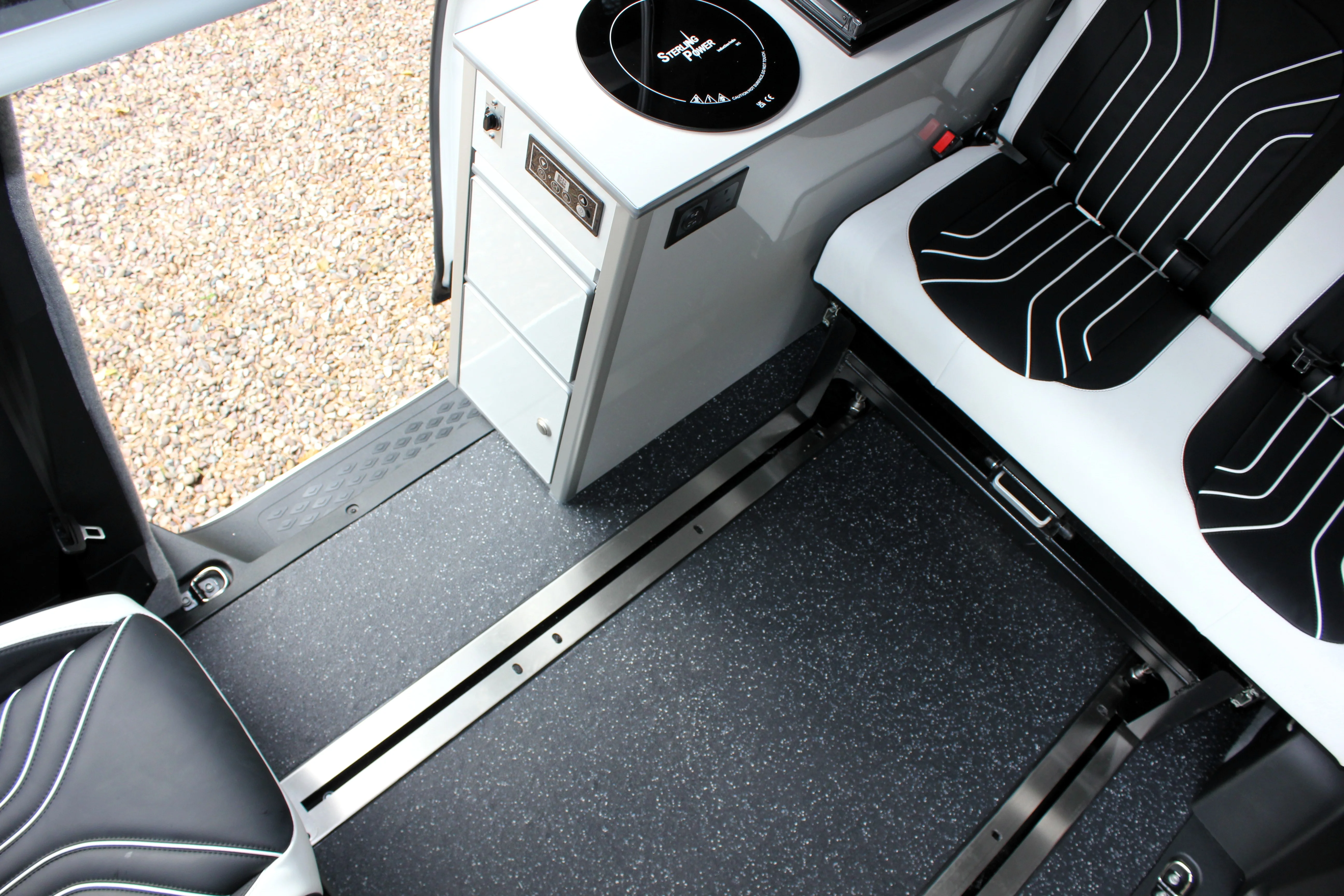 Electric M1 tested 2-seater Rock and Roll bed system upholstered in VW trim, with integrated floor rails