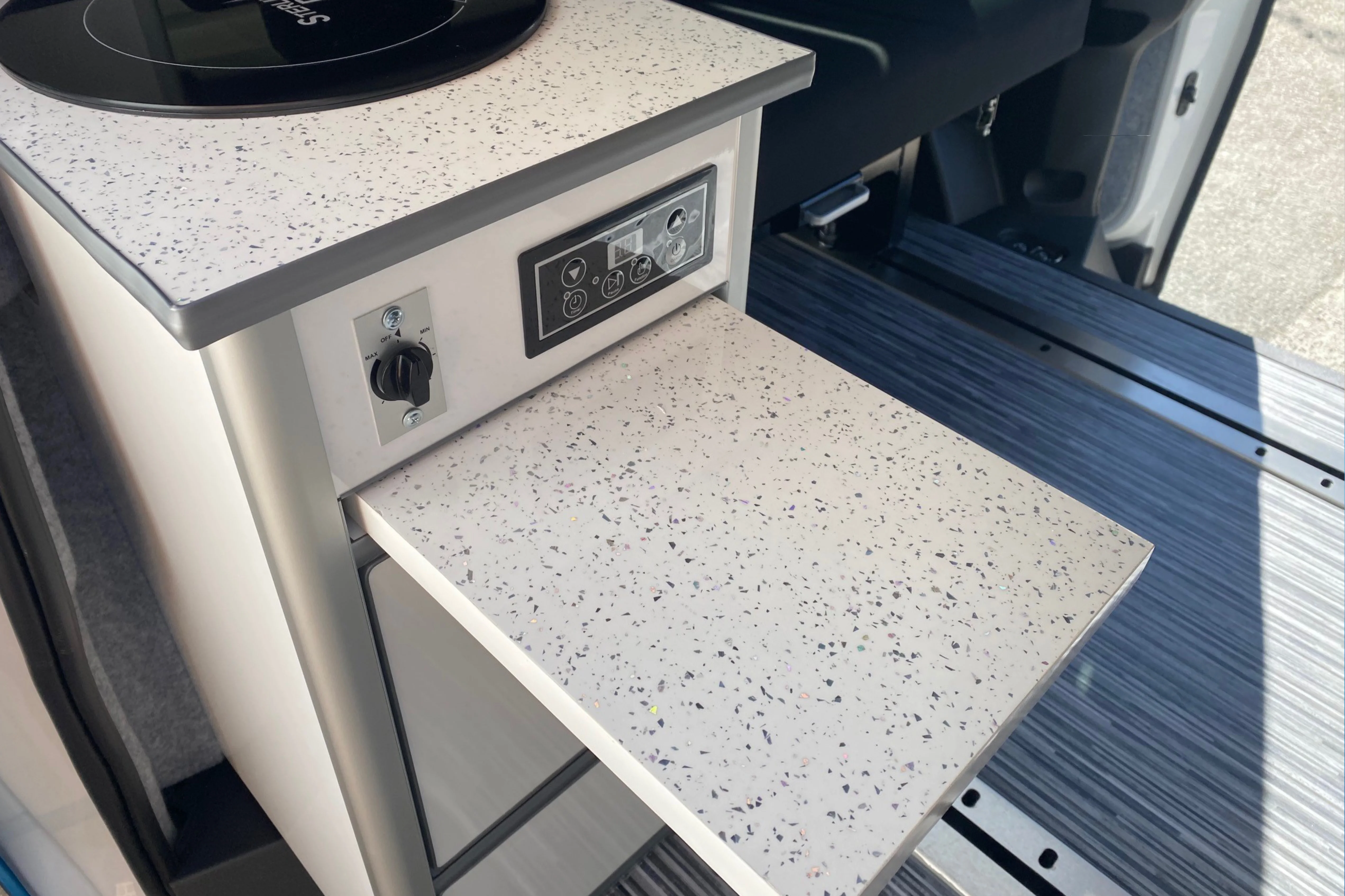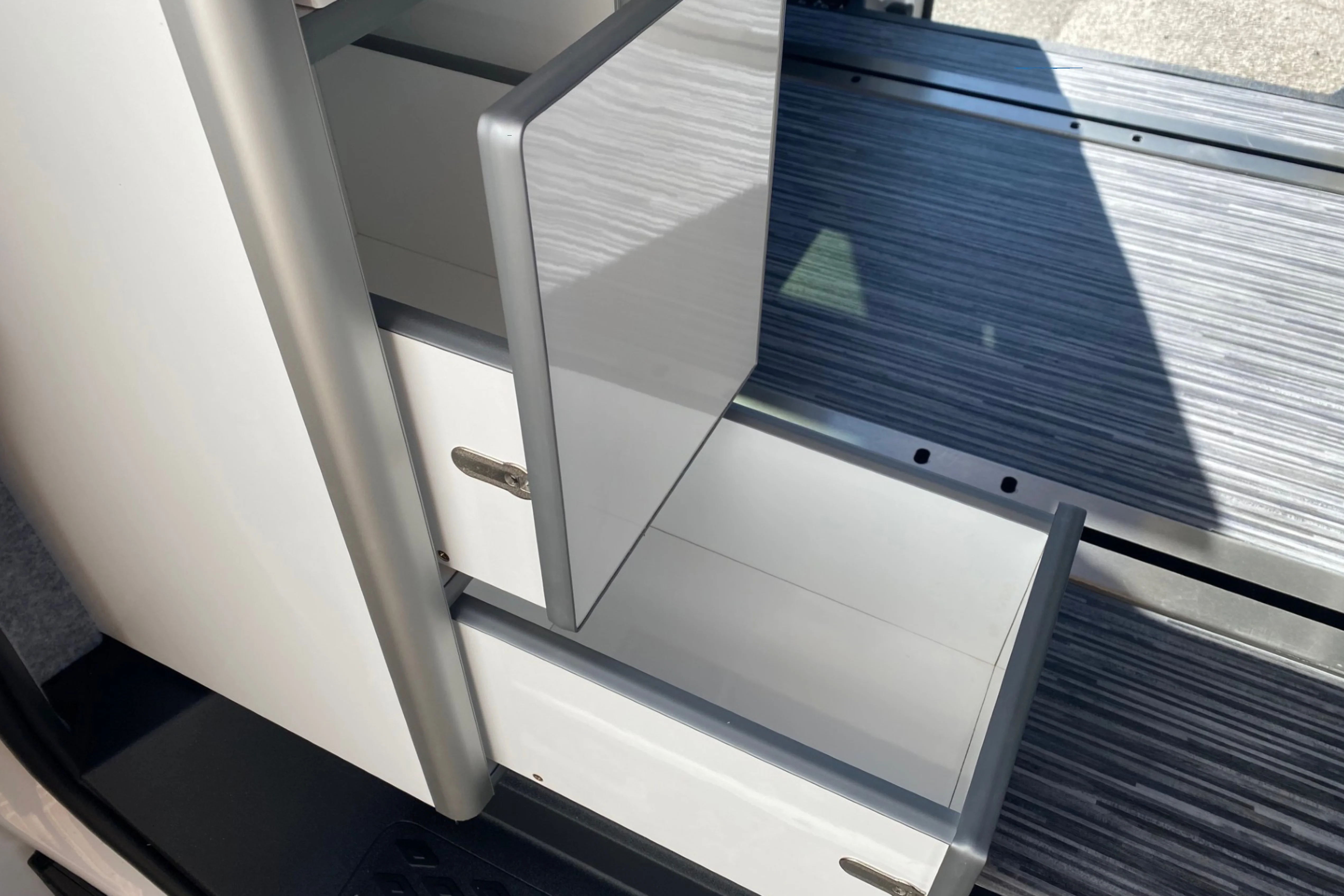 The Volkswagen ID. Buzz is an impressive electric campervan that skillfully combines nostalgia with state-of-the-art technology. Designed for families and urban mobility, our VW ID. Buzz campervan conversion offers a feel of spaciousness through its clever design which encompass access through either of its twin power-sliding doors. Built from the very finest of materials and using the absolute best products, as standard, this campervan conversion features an M1 certified crash tested rock and roll bed system with integrated floor rails and is complete with furniture to include a cupboard, draw and table for both elegance and practicality.