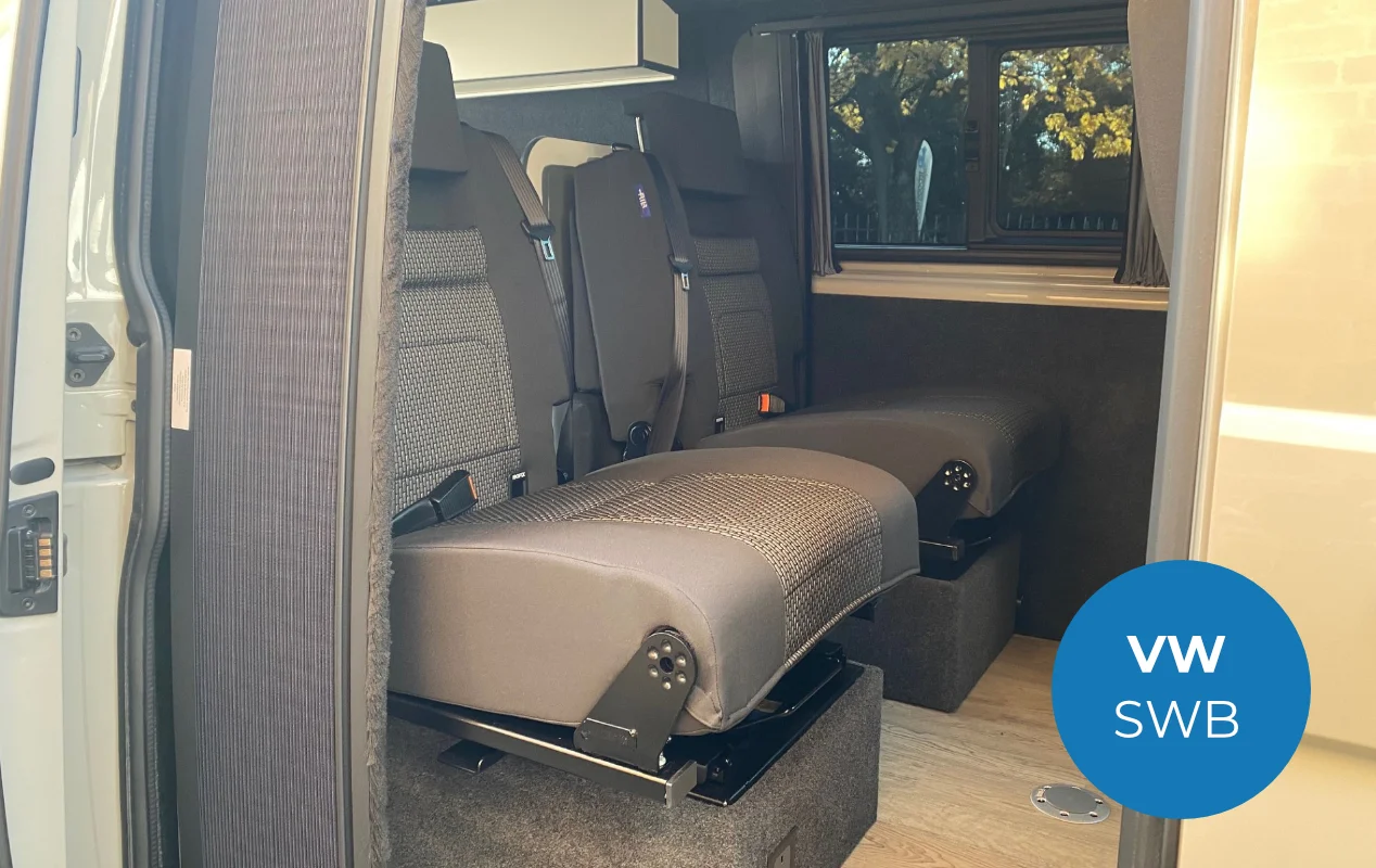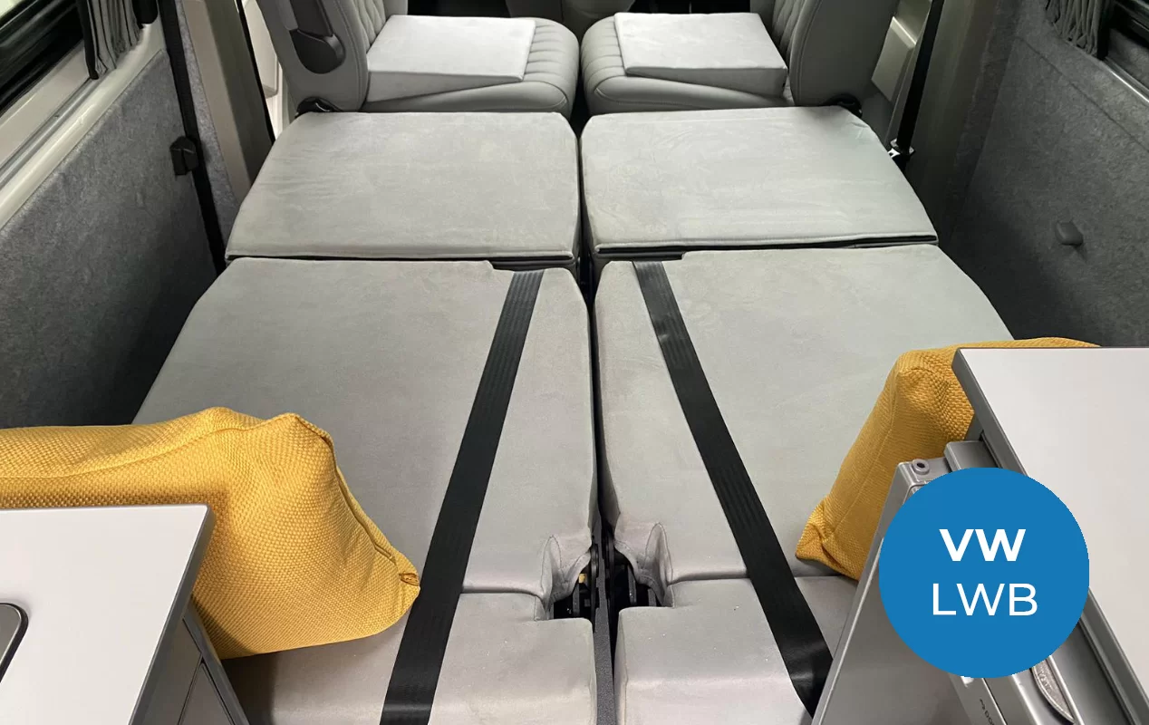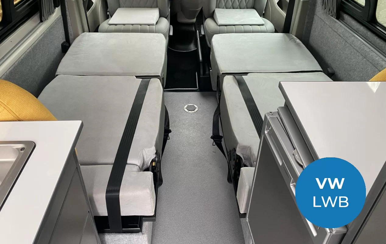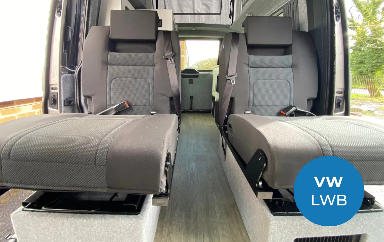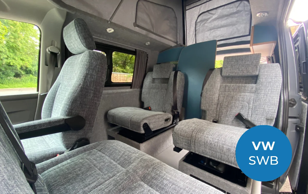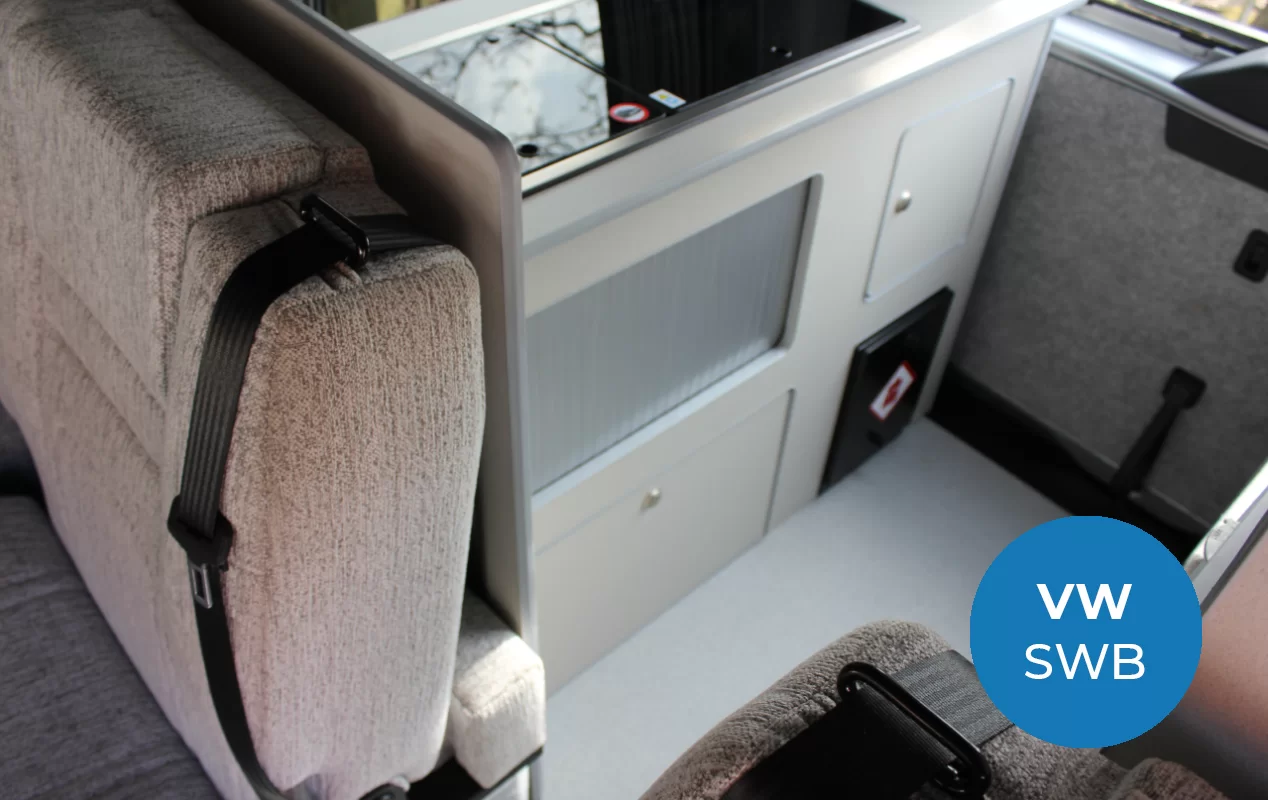 For parents wanting their children to sit closer to them near to the front of the camper or for couples planning a lot of travelling, our rear kitchen campervan conversion layouts make for comfortable wild camping, combined with great ‘go anywhere’ flexibility. With lots of storage space, this 4 or 5 seater, 2 or 4 berth family campervan boasts 2 single Neptune RIB M1 tested beds with sliders and integrated headrests, as standard, whilst offering housing space for a porta potti or fixed flush toilet. Add our heating and hot water system and you can even have a hot shower!