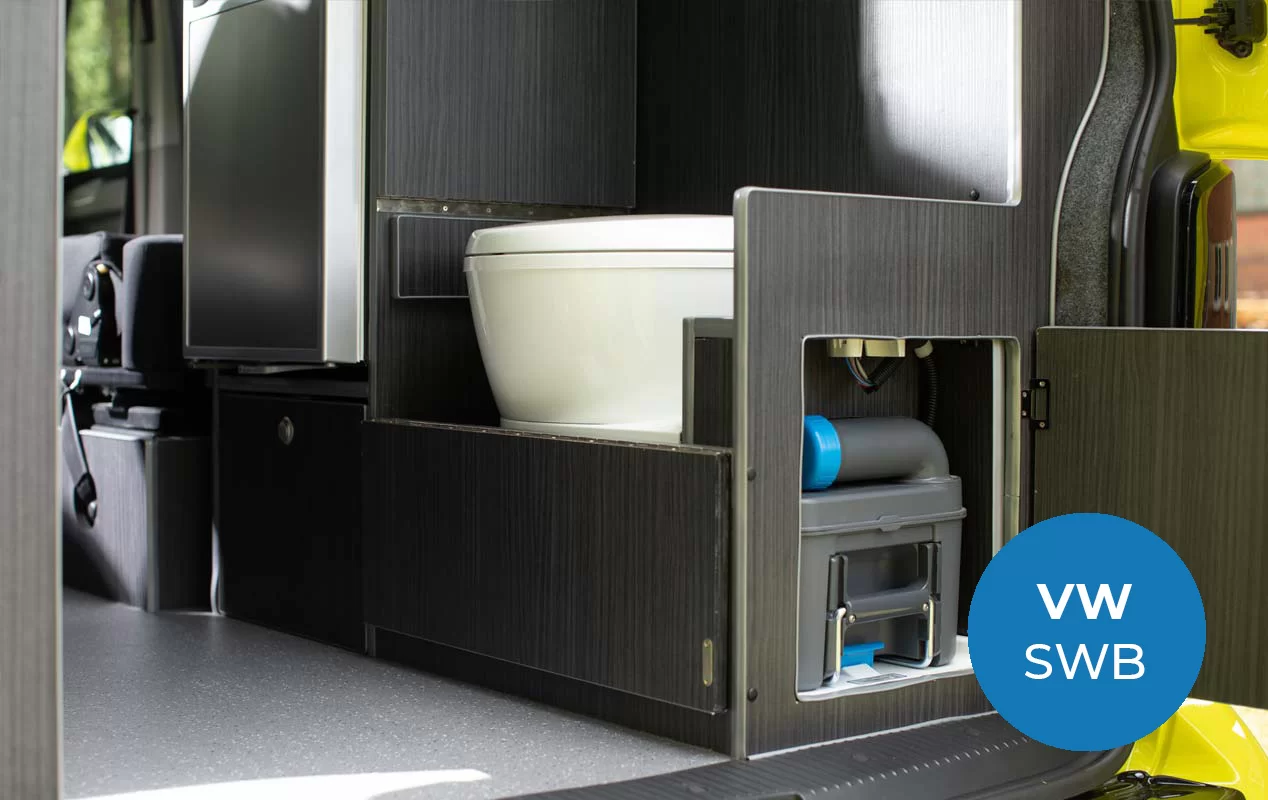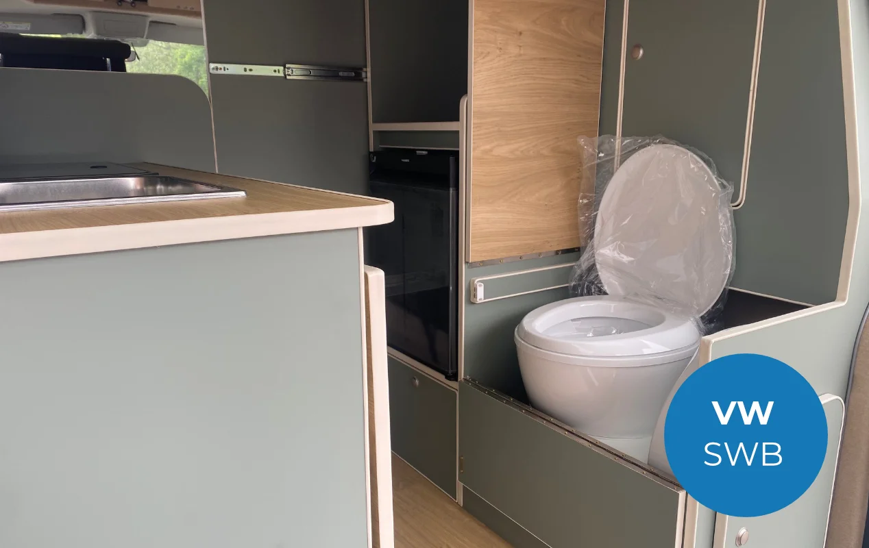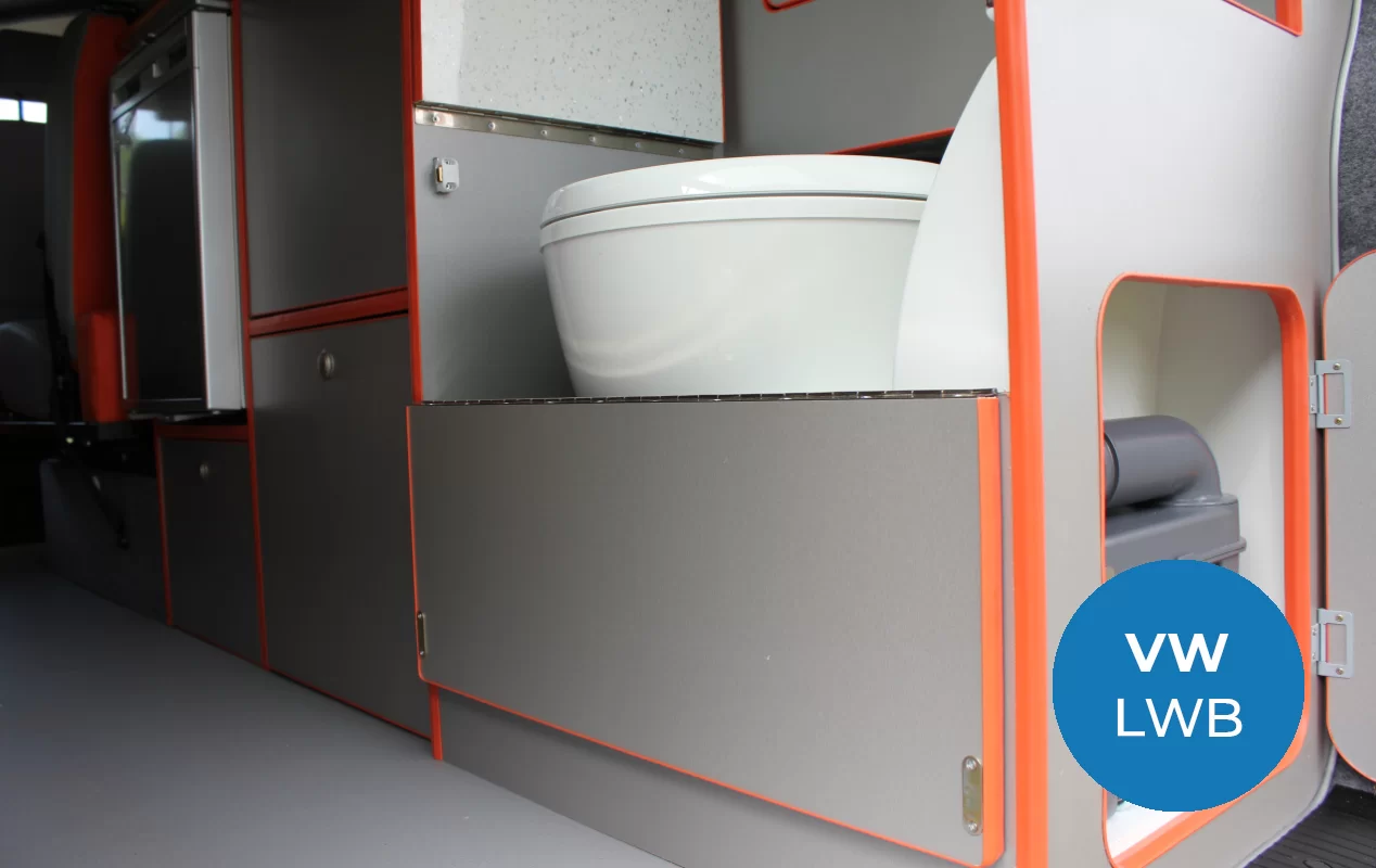 Our Harvington self sufficient camper conversion layout features a rear kitchen area, to offer a more flexible camping layout. Our flagship design developed by us since 2012, with a reverse style layout and rear elevating roof this layout allows for more room at the rear of the campervan giving you a large rear galley style kitchen area with lots of cupboards space. There’s even space for a fitted flush toilet!