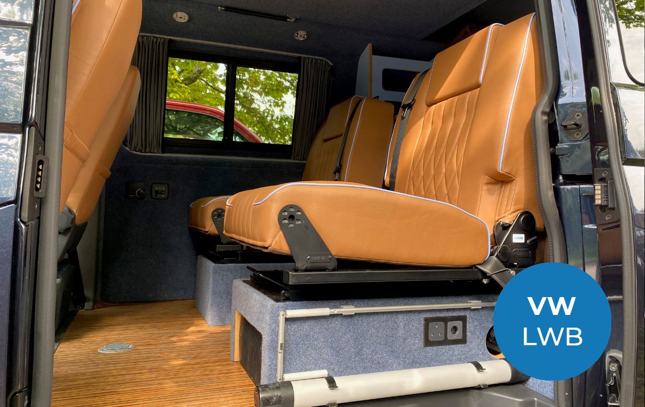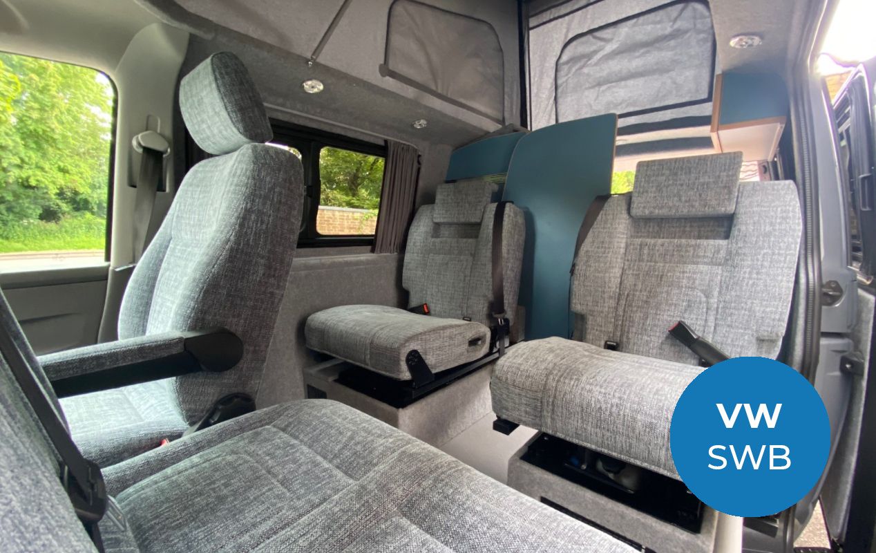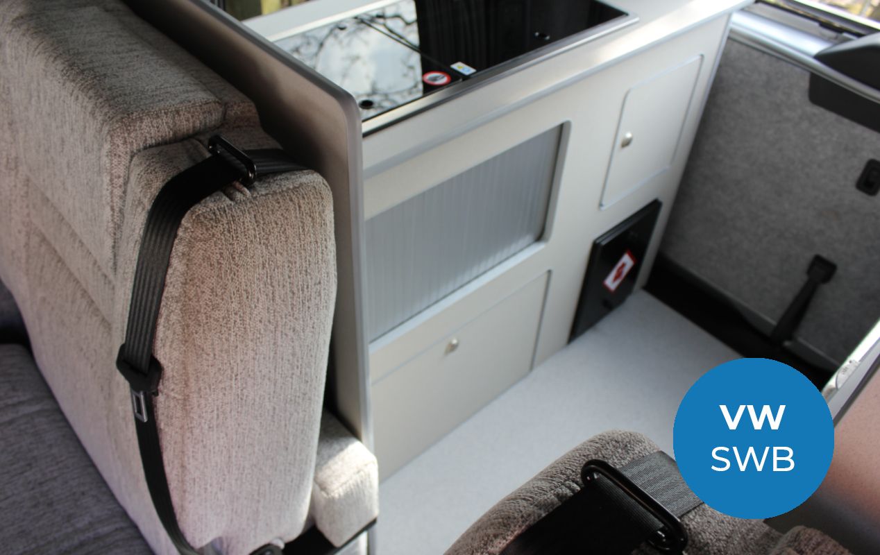 For parents wanting their children to sit closer to them near to the front of the camper or for couples planning a lot of travelling, our rear kitchen campervan conversion layouts make for comfortable wild camping, combined with great ‘go anywhere’ flexibility. With lots of storage space, this 4 or 5 seater, 2 or 4 berth family campervan boasts 2 single Neptune RIB M1 tested beds with sliders and integrated headrests, as standard, whilst offering housing space for a porta potti or fixed flush toilet. Add our heating and hot water system and you can even have a hot shower!
