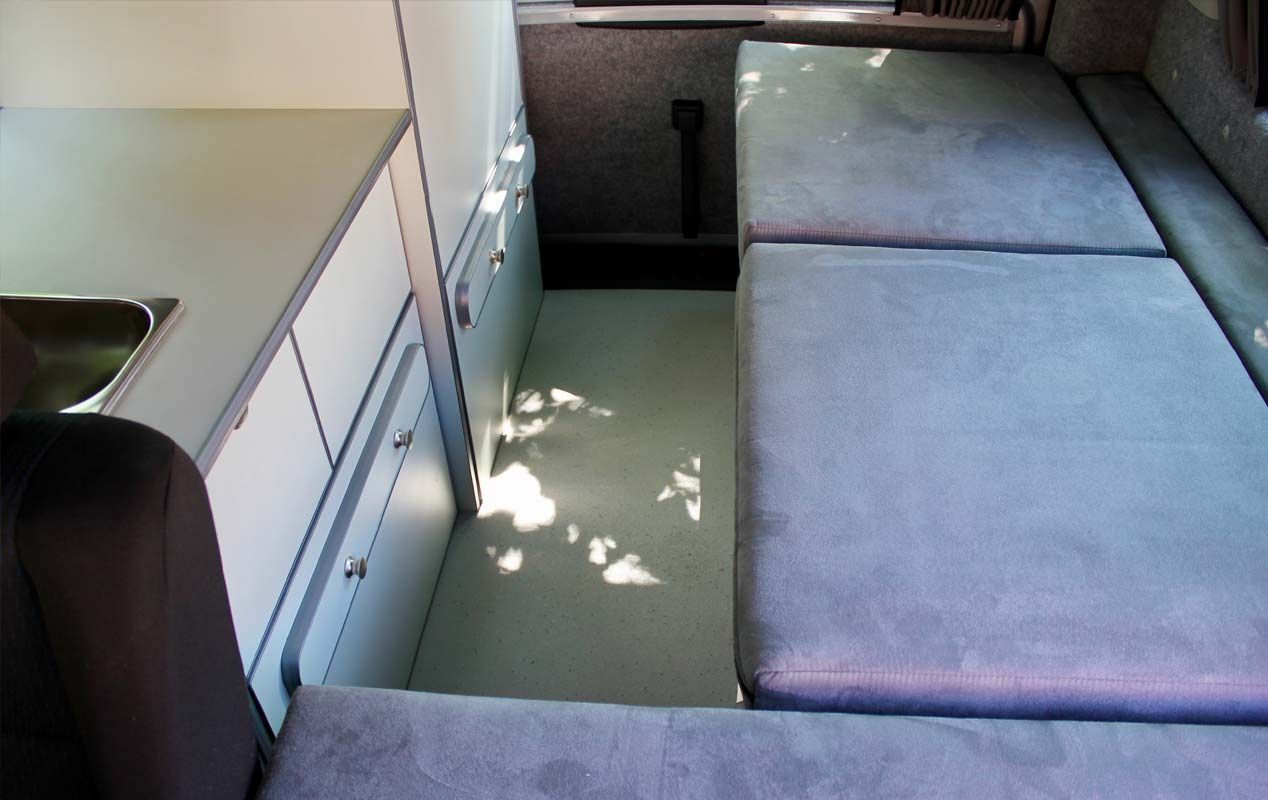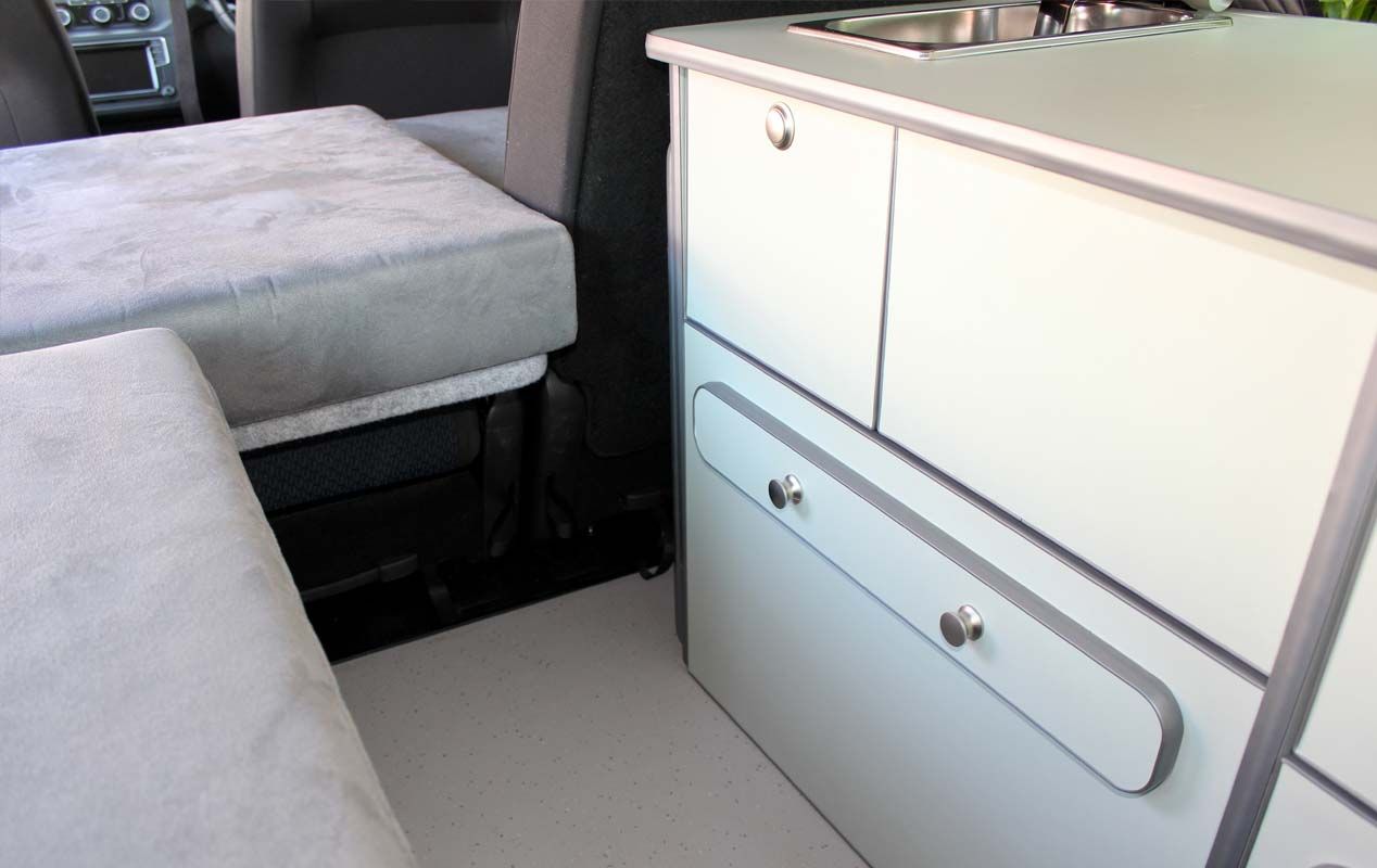 With two layout options available, we can either convert a VW Caddy Maxi Life and retain the factory rear travelling seats or provide a scaled down version of our Cragwood conversion with rock and roll bed system.